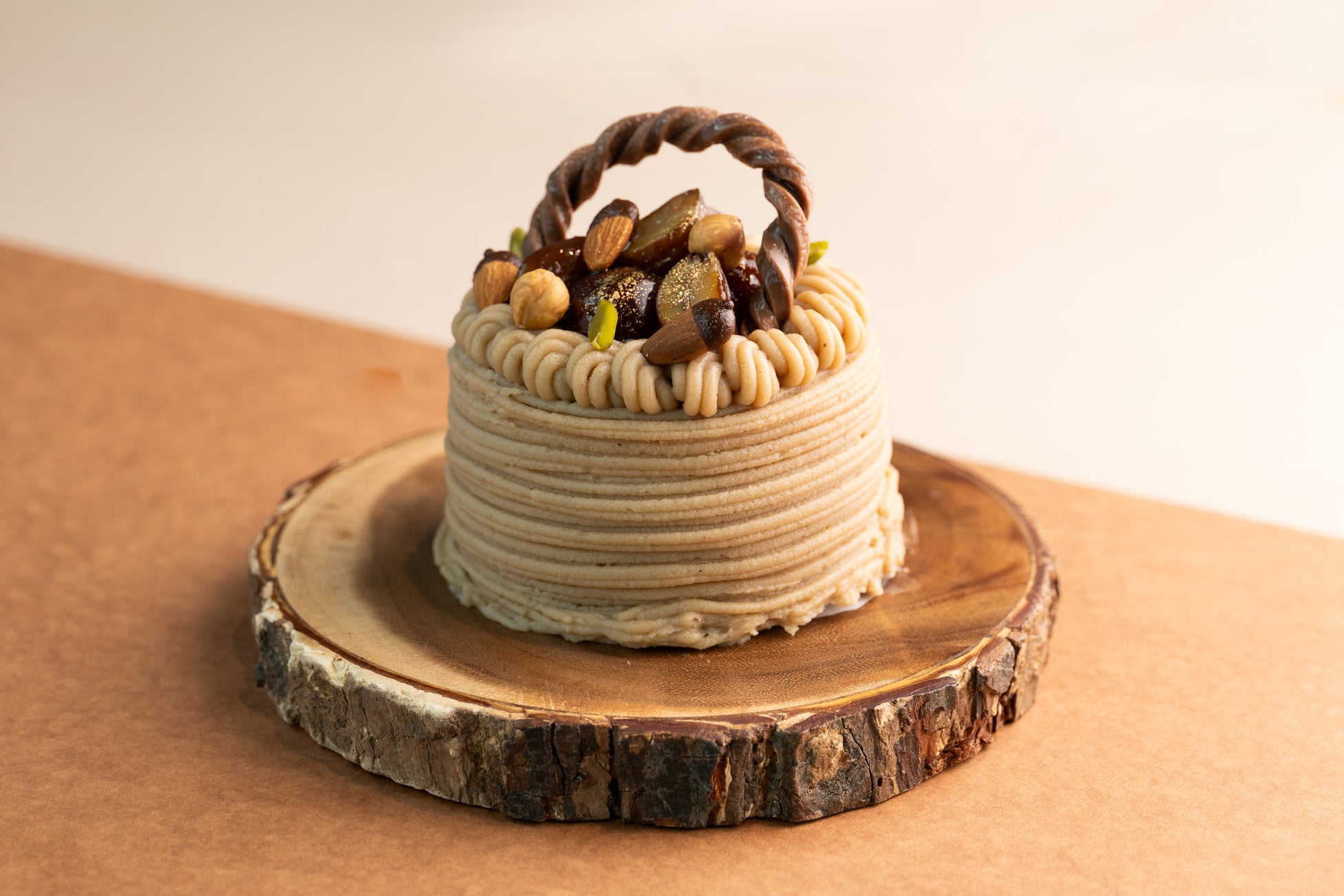 秋の木の実を詰め込んだバスケットをモチーフにしたかわいらしいモンブランケーキ。食べ応えのある特製モンブランクリームとチョコレート風味のスポンジケーキは相性抜群です。仕上げに贅沢に丸ごとの栗とどんぐりに見立てたアーモンドをトッピングしました。