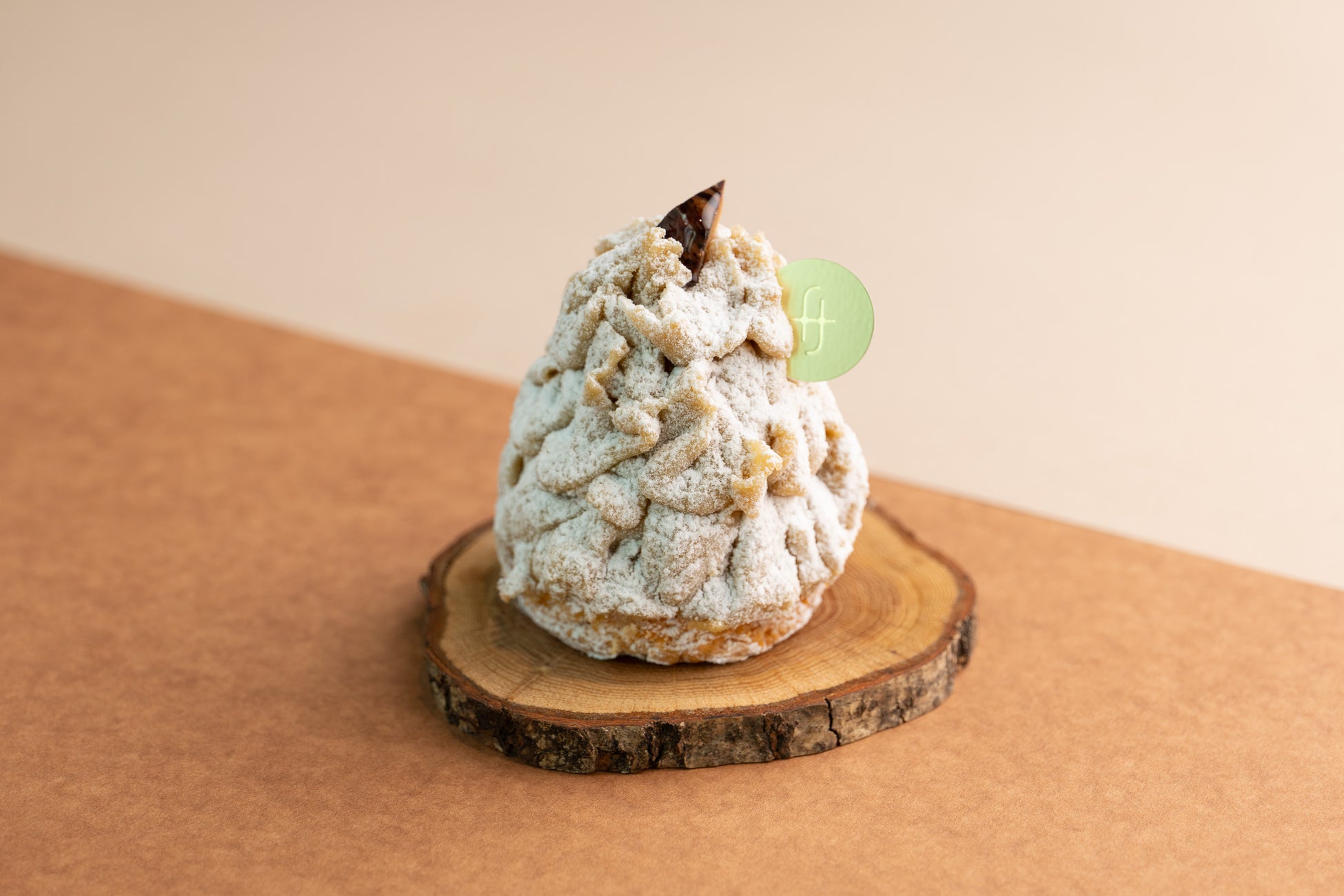 熊本県阿蘇産の和栗をふんだんに使用した贅沢モンブラン。特別にオーダーした2㎜メッシュで裏ごしたきめの細かいFRUCTUSオリジナルの栗ペーストをドレープ状にたっぷりと絞っています。タルト生地のうえには、和栗のクリームや刻んだ栗の甘露煮、生クリームを乗せています。さらに、蒸留酒「キルシュ」が香るアイコニックな栗ペーストがアクセントになっています。