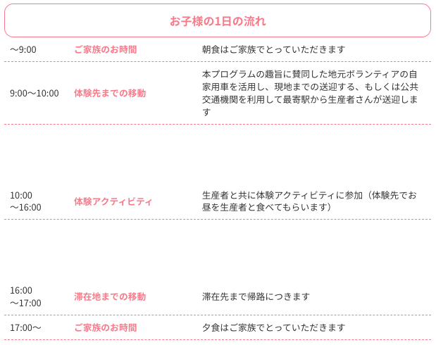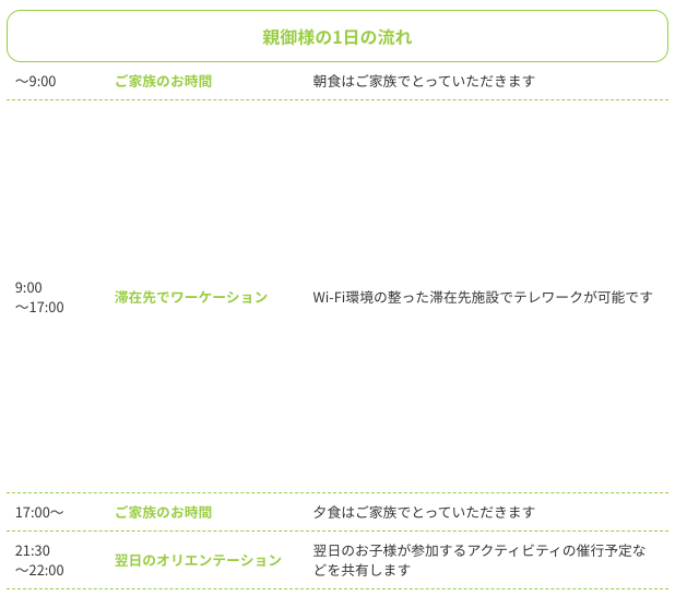 お子さんと親御さん、それぞれに適した滞在スケジュールを用意しています。
