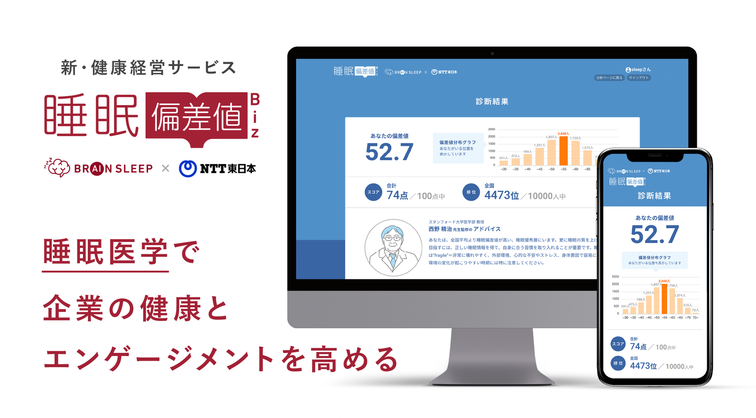 現在は、NTT東日本をイノベーションパートナーとして、企業向け健康経営サービス「睡眠偏差値for Biz」を展開しております。従業員の「睡眠」から企業との「エンゲージメント」を可視化し、さらに、全国の睡眠偏差値と比較することで、自社だけでは表面化されていない課題に新たに気づくことができ、プレゼンティズムを改善することができるサービスです。