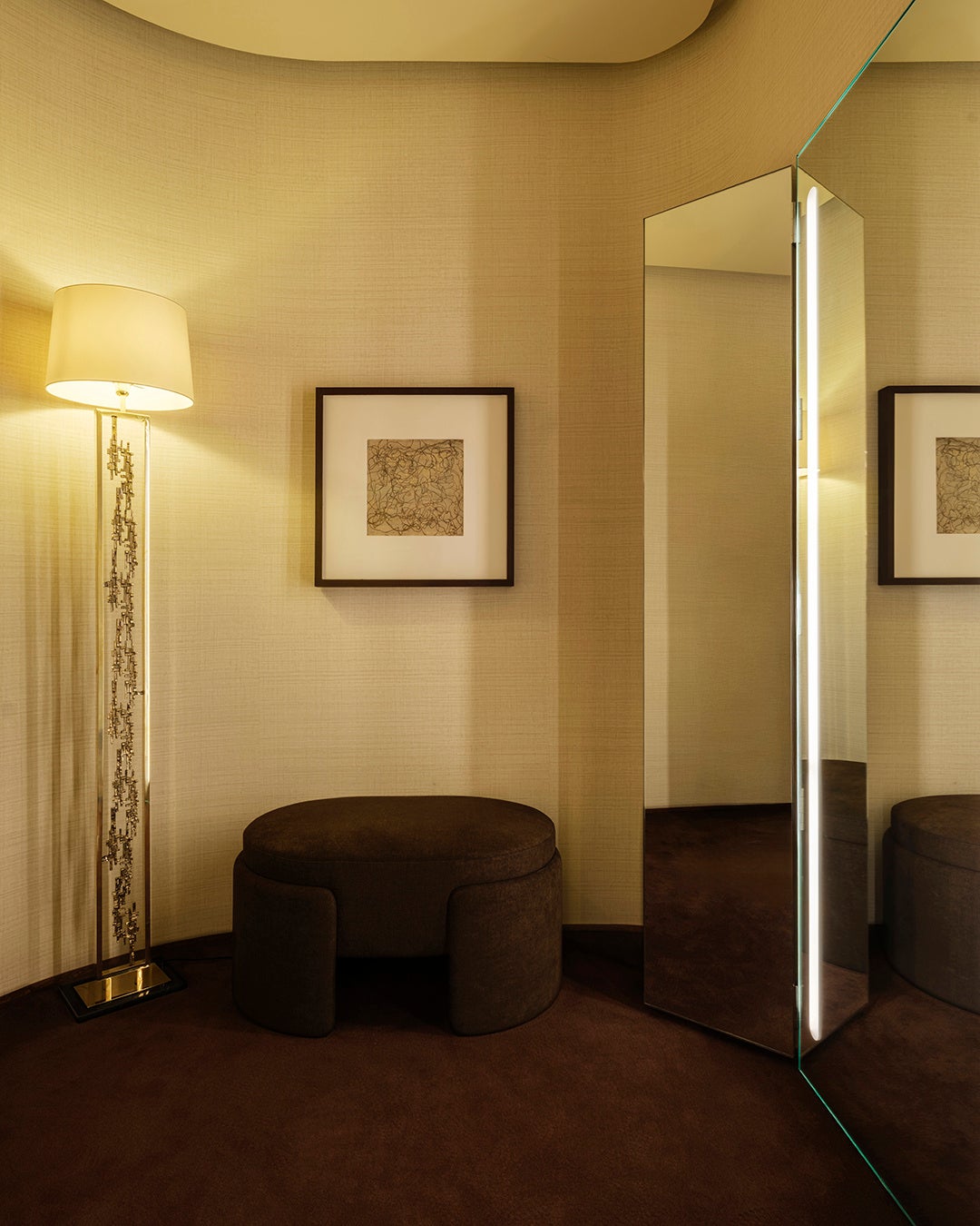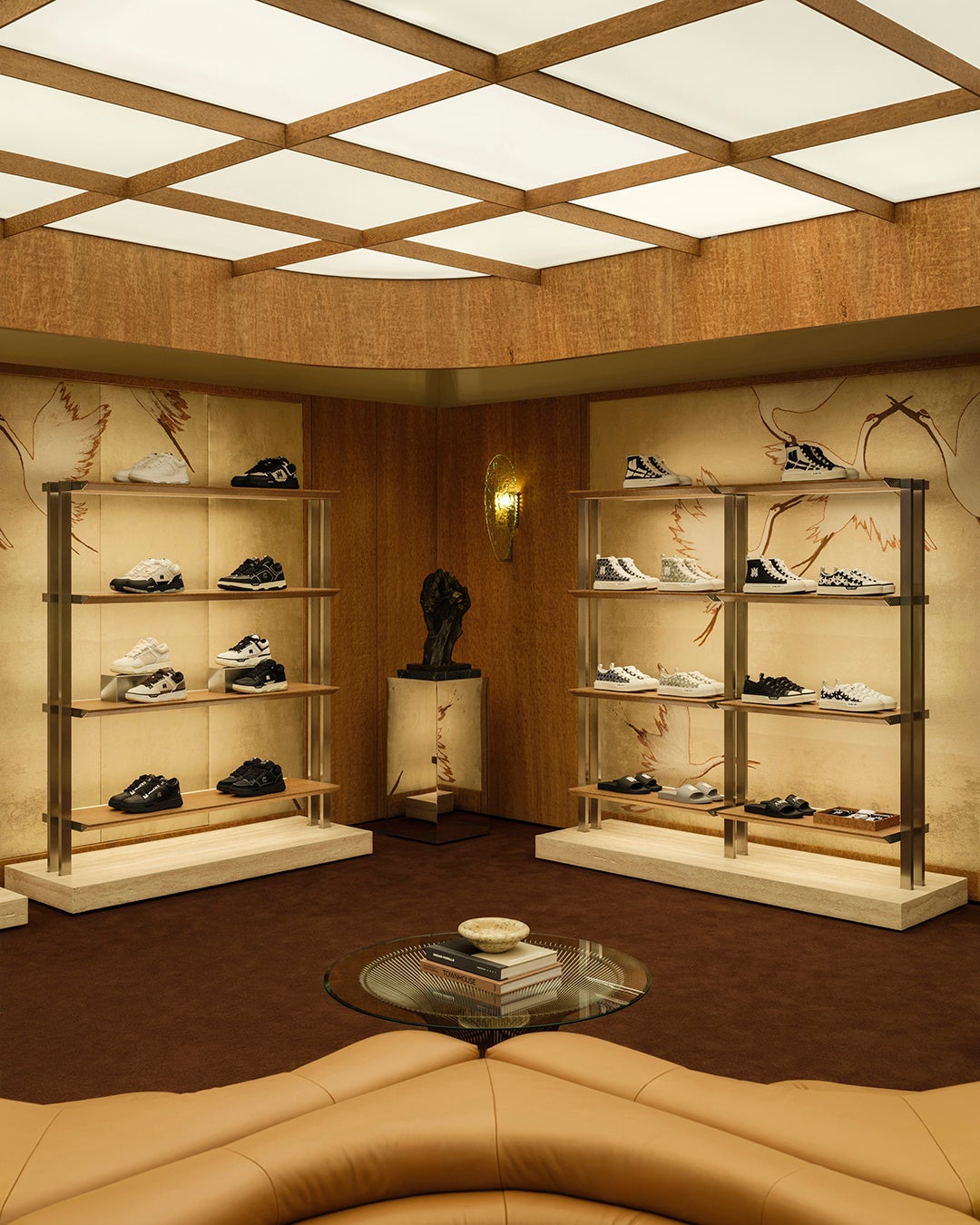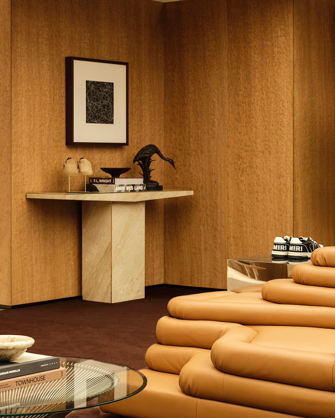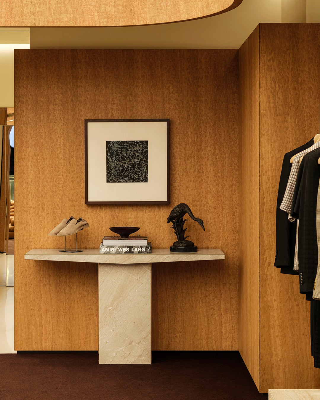 壁面装飾には多様な素材が組み合わされ、ポメレ材を用いた特注のボワズリー(壁の木製装飾)と大判のタペストリーアートが並置されており、いずれもロンドンとロサンゼルスの歴史を本質的に結びつけるアール・デコ様式を彷彿とさせます。落ち着いた色調は、アミリに常にインスピレーションを与えてきた西海岸のカラーパレットを反映しており、砂漠を思わせるニュートラルカラーの深みのあるブラウンやクリーム色が用いられています。トラバーチンやオニキス、ストーン、さらに上質な張地やファブリックの壁面仕上げが、冷たさと暖かさのコントラストを生み出し、アミリのコレクションの背景として、様々な時代の華やかさをノスタルジックに映し出しています。