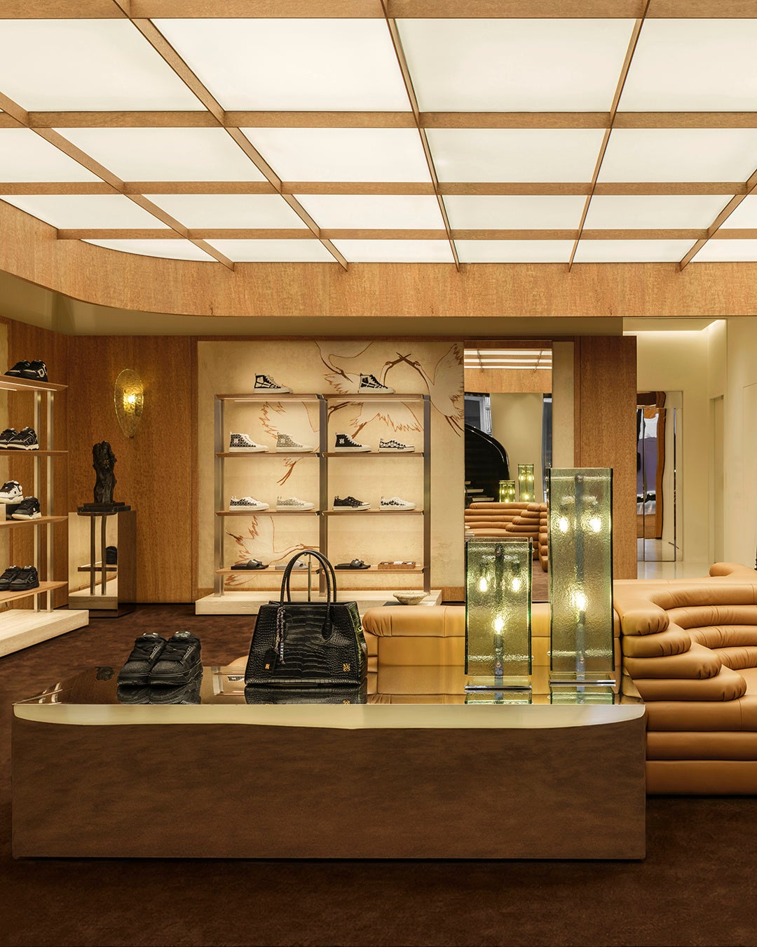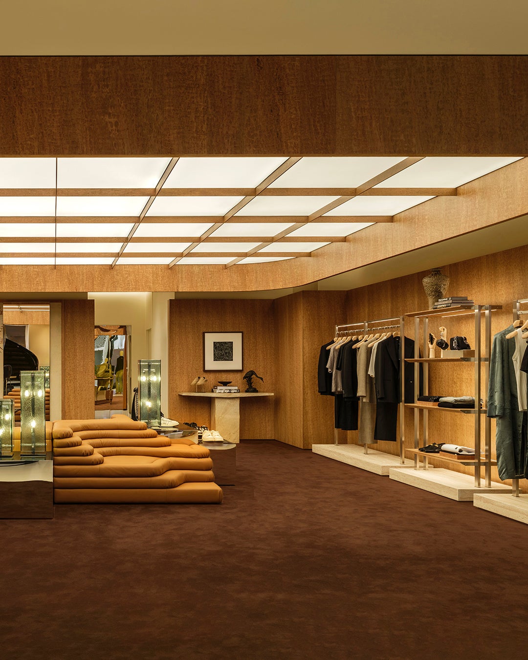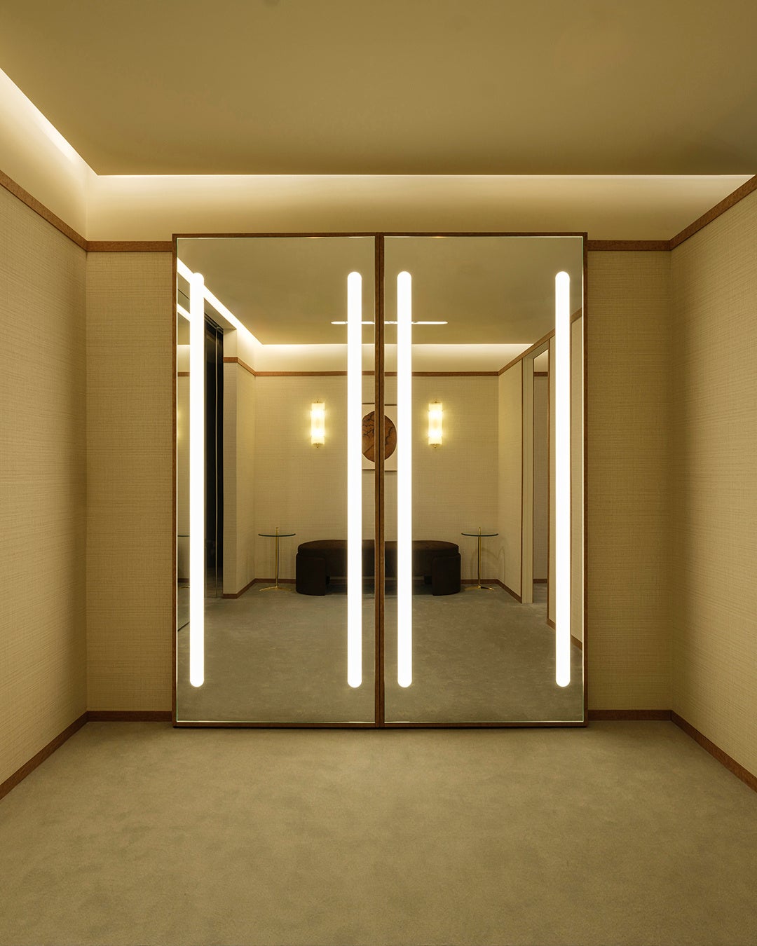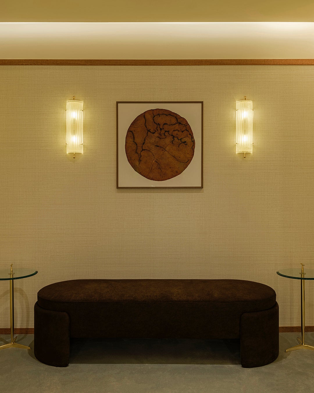 壁面装飾には多様な素材が組み合わされ、ポメレ材を用いた特注のボワズリー(壁の木製装飾)と大判のタペストリーアートが並置されており、いずれもロンドンとロサンゼルスの歴史を本質的に結びつけるアール・デコ様式を彷彿とさせます。落ち着いた色調は、アミリに常にインスピレーションを与えてきた西海岸のカラーパレットを反映しており、砂漠を思わせるニュートラルカラーの深みのあるブラウンやクリーム色が用いられています。トラバーチンやオニキス、ストーン、さらに上質な張地やファブリックの壁面仕上げが、冷たさと暖かさのコントラストを生み出し、アミリのコレクションの背景として、様々な時代の華やかさをノスタルジックに映し出しています。