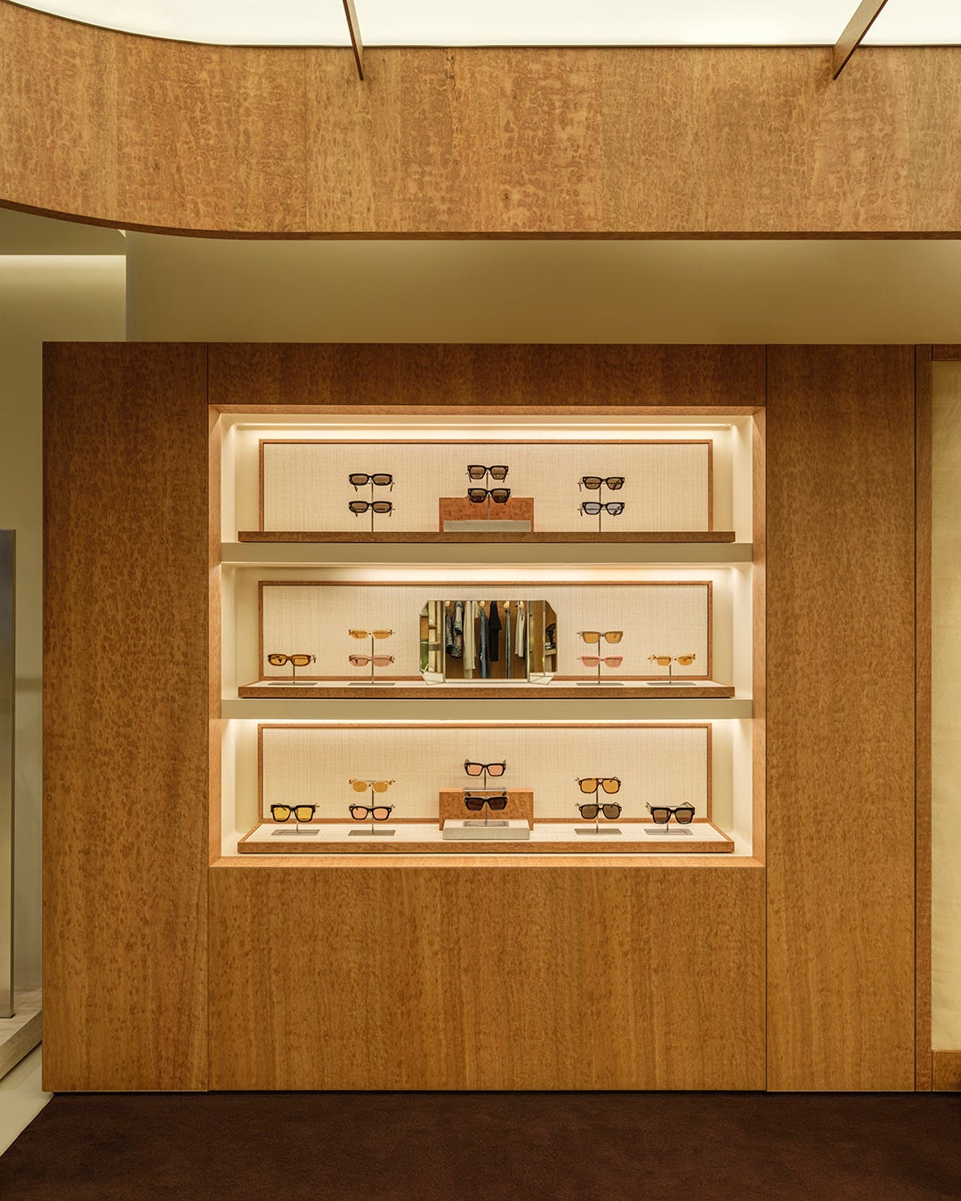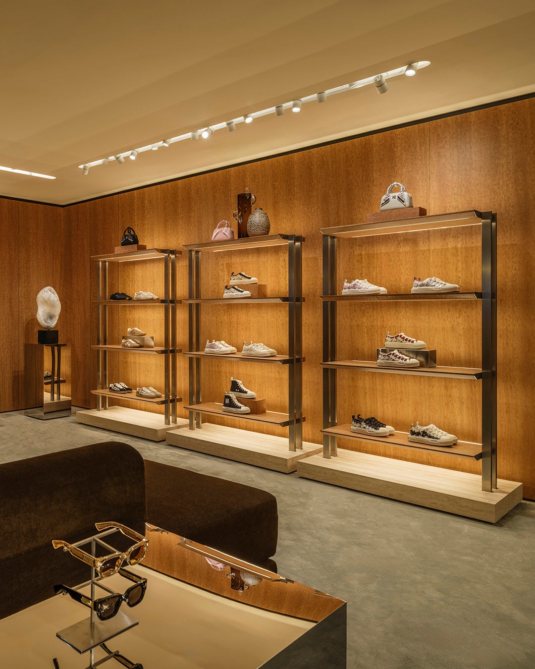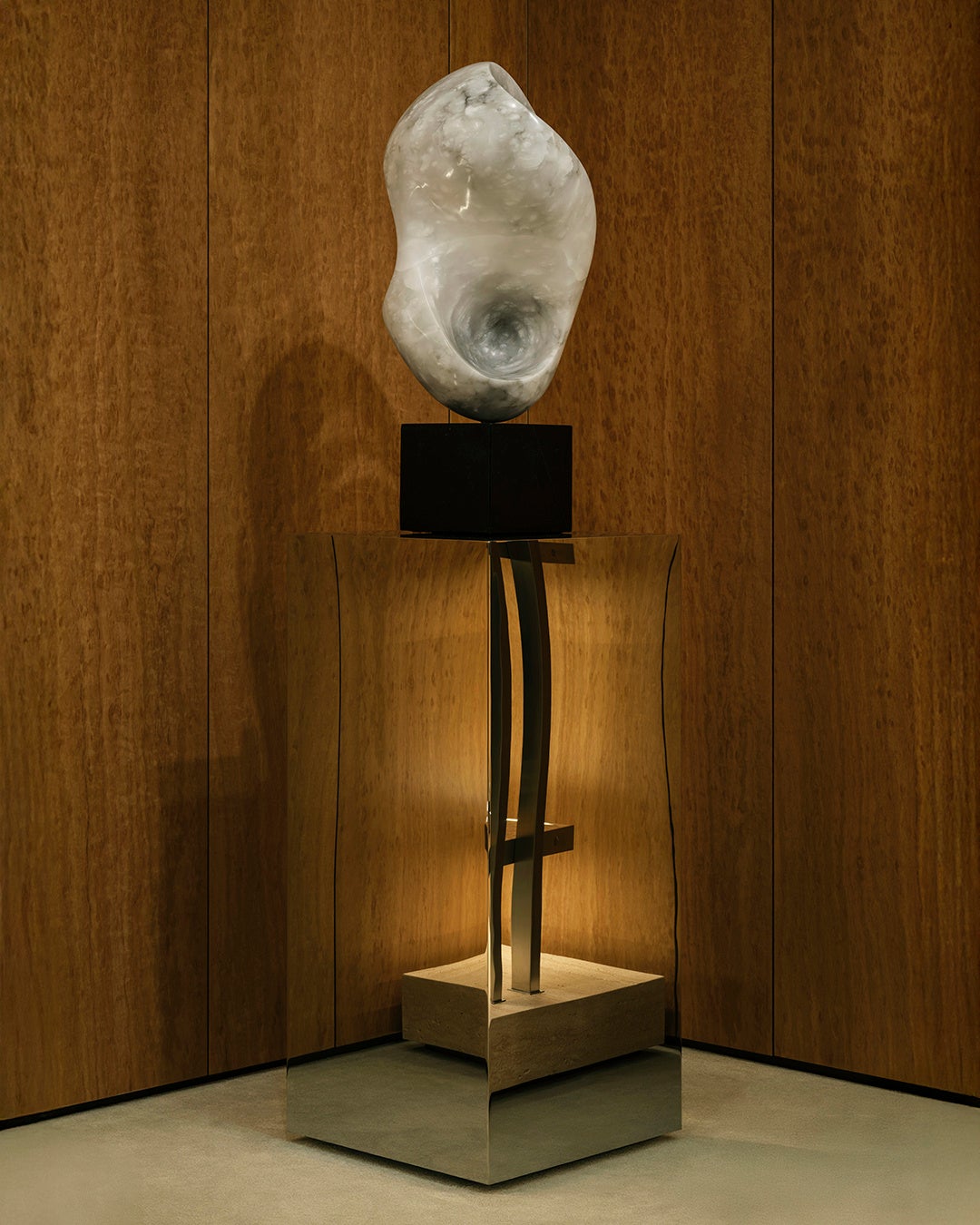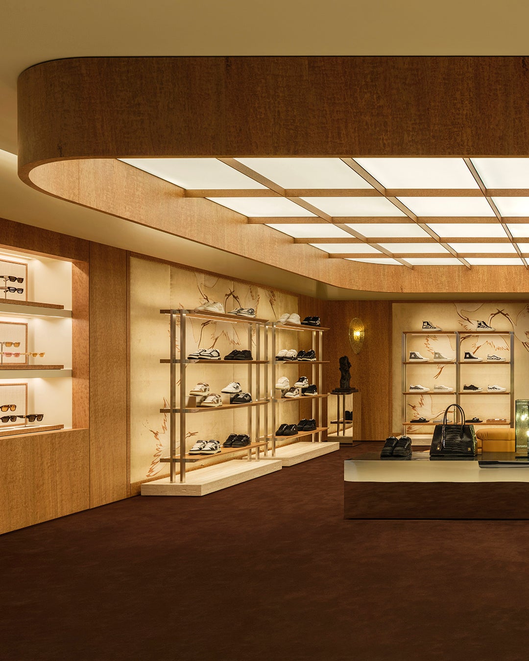 壁面装飾には多様な素材が組み合わされ、ポメレ材を用いた特注のボワズリー(壁の木製装飾)と大判のタペストリーアートが並置されており、いずれもロンドンとロサンゼルスの歴史を本質的に結びつけるアール・デコ様式を彷彿とさせます。落ち着いた色調は、アミリに常にインスピレーションを与えてきた西海岸のカラーパレットを反映しており、砂漠を思わせるニュートラルカラーの深みのあるブラウンやクリーム色が用いられています。トラバーチンやオニキス、ストーン、さらに上質な張地やファブリックの壁面仕上げが、冷たさと暖かさのコントラストを生み出し、アミリのコレクションの背景として、様々な時代の華やかさをノスタルジックに映し出しています。