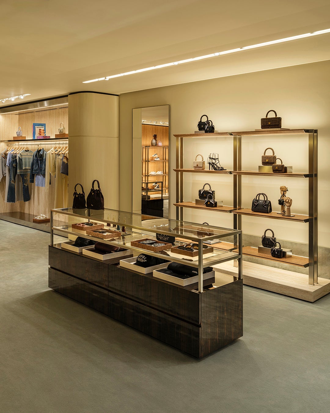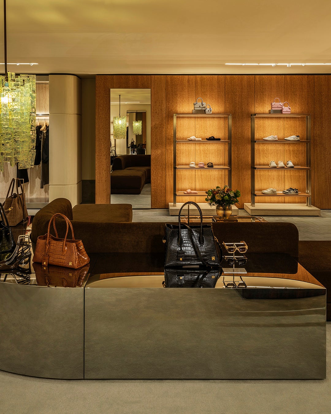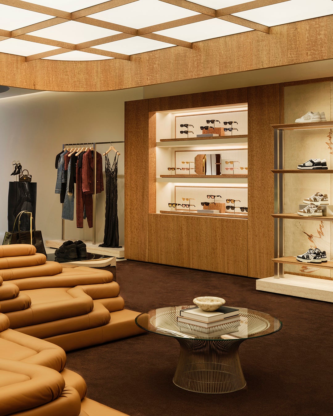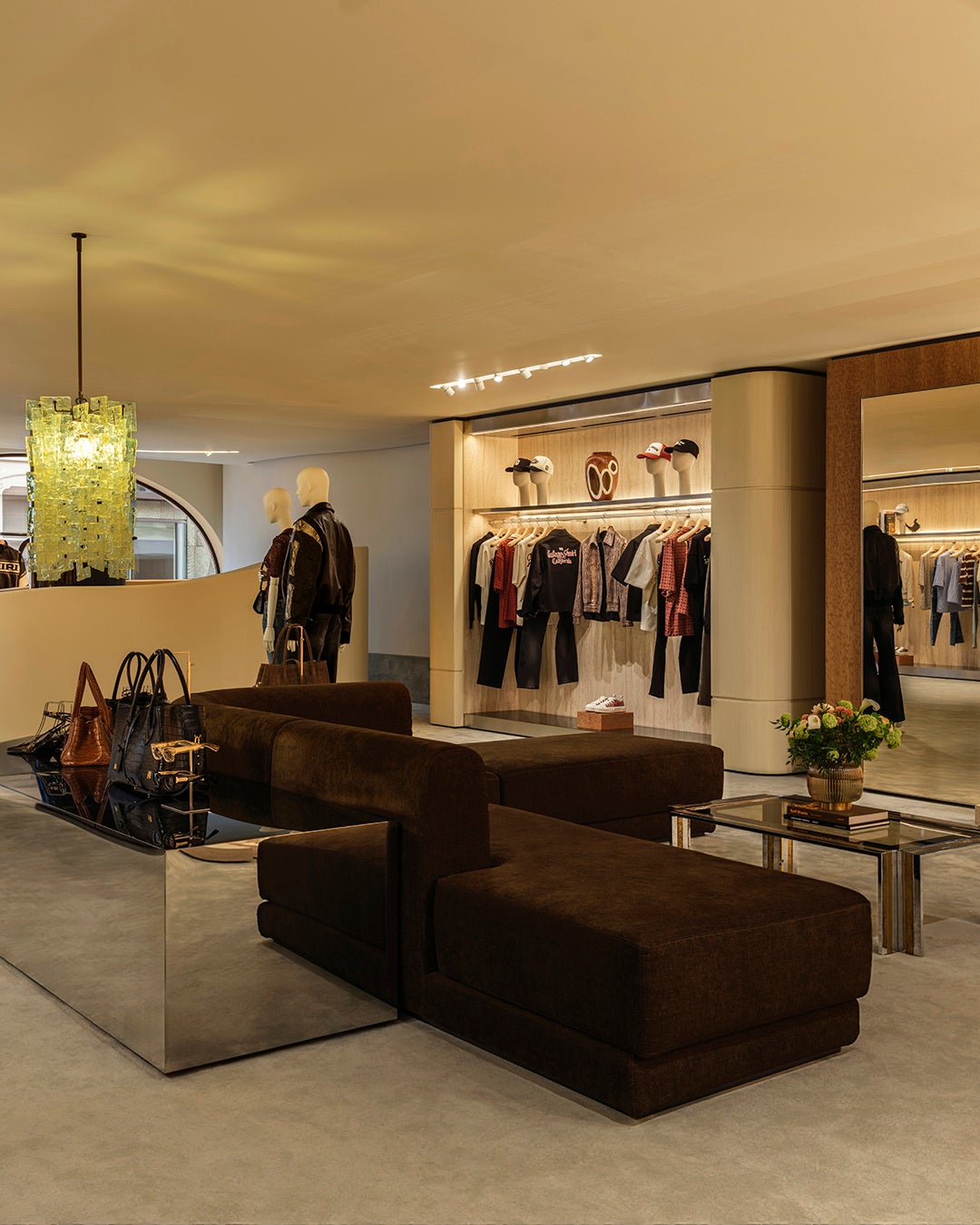 創業者兼クリエイティブ・ディレクターであるマイク・アミリ独自の美意識、すなわちロサンゼルスで生まれたモダンなアメリカンラグジュアリーを反映したインテリアデザインを特徴とするロンドンの旗艦店は、2フロアで構成され、アクセサリーやフットウエアを含むメンズおよびウィメンズのコレクションを展開します。空間全体はシネマティックな雰囲気に包まれ、ハリウッド黄金期の映画セットを想起させる装飾が施されています。各エリアがそれぞれ異なる個性を持ち、独自のシーンを創り出しています。
