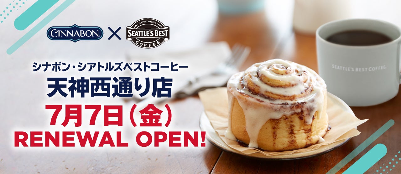 シナボン・シアトルズベストコーヒー天神西通り店では、「シナボン」で定番のシナモンロールと相性抜群のスペシャルティコーヒーや各種ドリンクに加え、「シアトルズベストコーヒー」で好評のパスタやサンド、ケーキなどフードメニューを豊富に取り揃えております。スタッフ一同、皆さまのお越しを心よりお待ちしております。