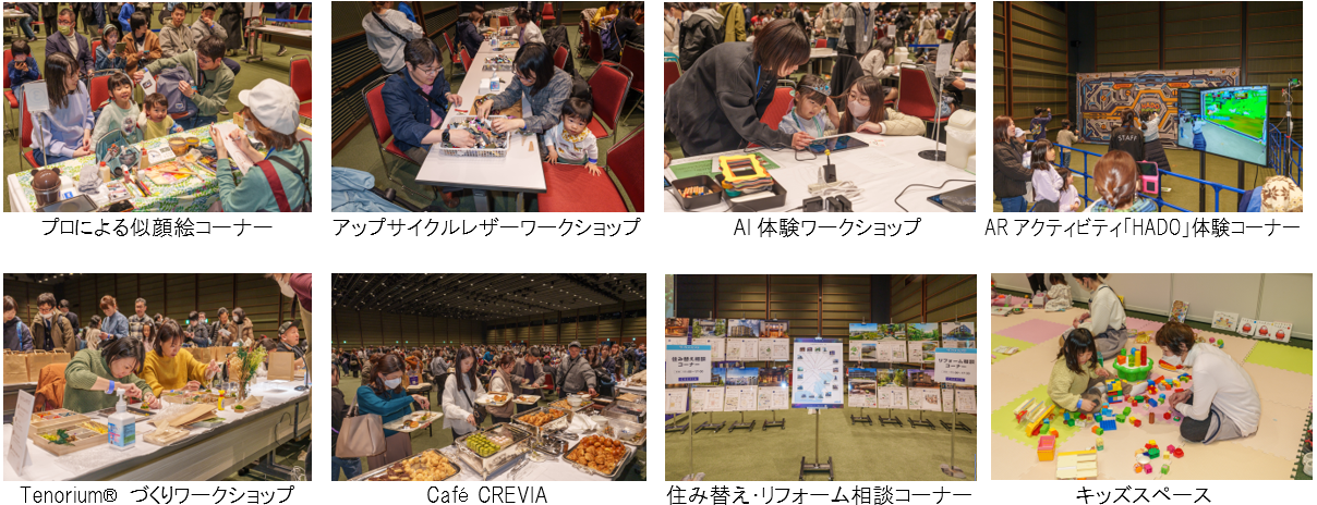当日は、タレントのなかやまきんに君さんをゲストに迎えた「親子筋トレ体験」のステージコンテンツを中心に、「CREVIA」が掲げる住まいづくりの指針「6 つの約束」を具現化する多数の体験型ワークショップを展開。最先端の技術に触れる、新感覚AR アクティビティ「HADO」体験や描いたイラストと自由に会話ができる「AI 体験コーナー」、親子で楽しめる「似顔絵コーナー」、捨てられるはずだった廃材で作る「レザーワークショップ」、日々を彩る鎌倉の工芸品「てのリウムづくり体験」、交流・懇親の場としての「Café CREVIA」など、幅広い世代が“私らしく”楽しめる内容を提供しました。