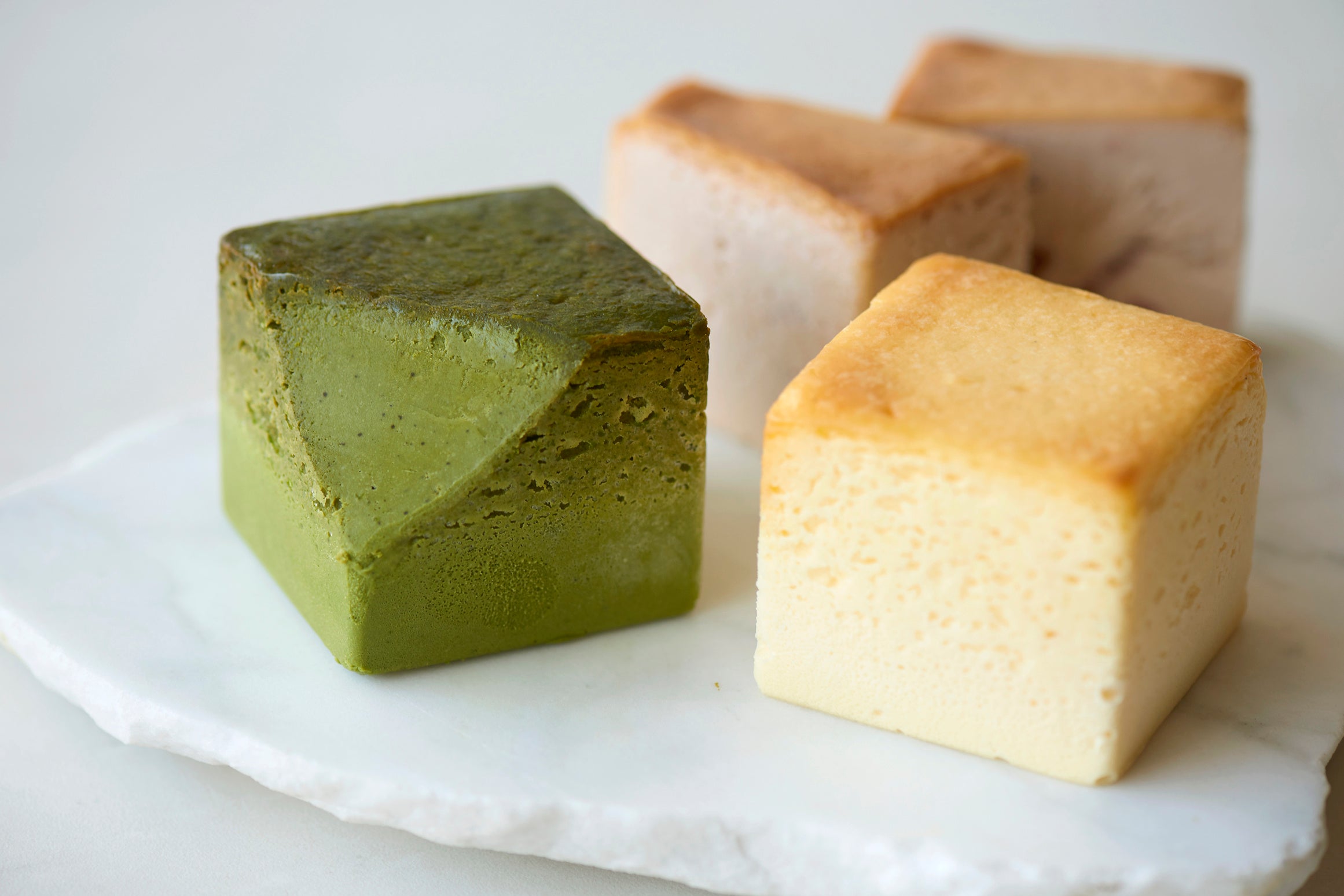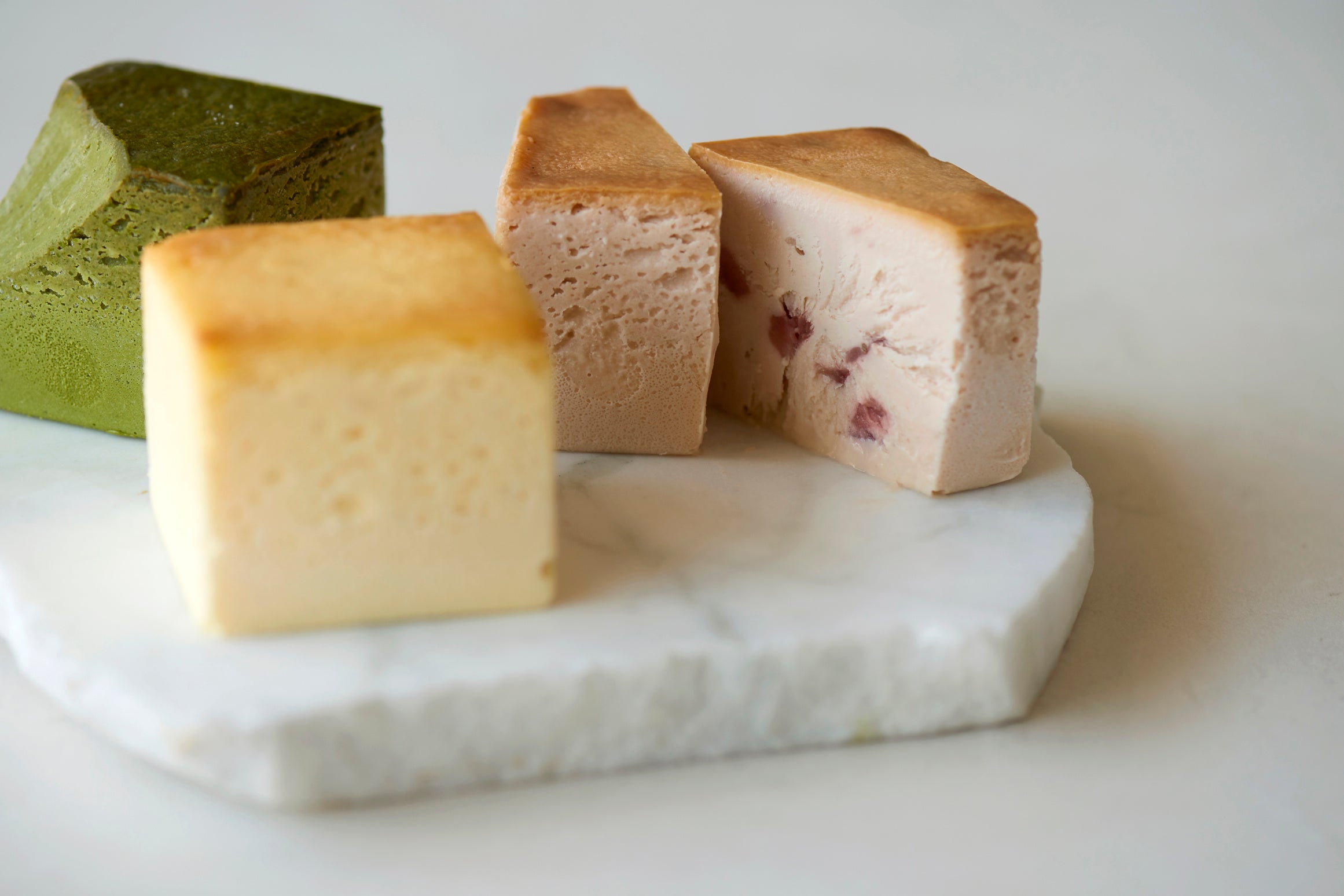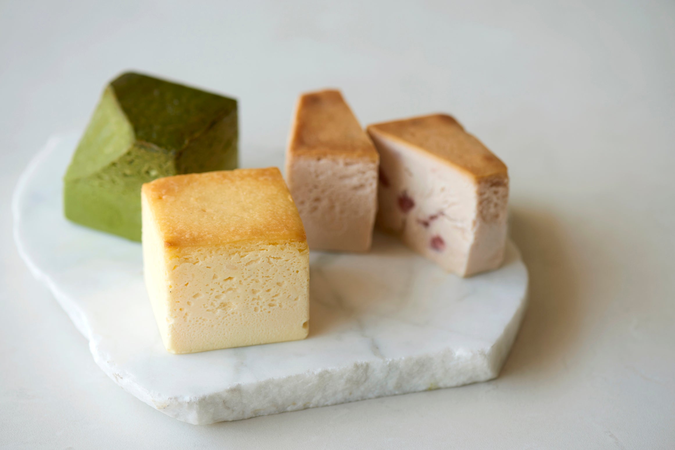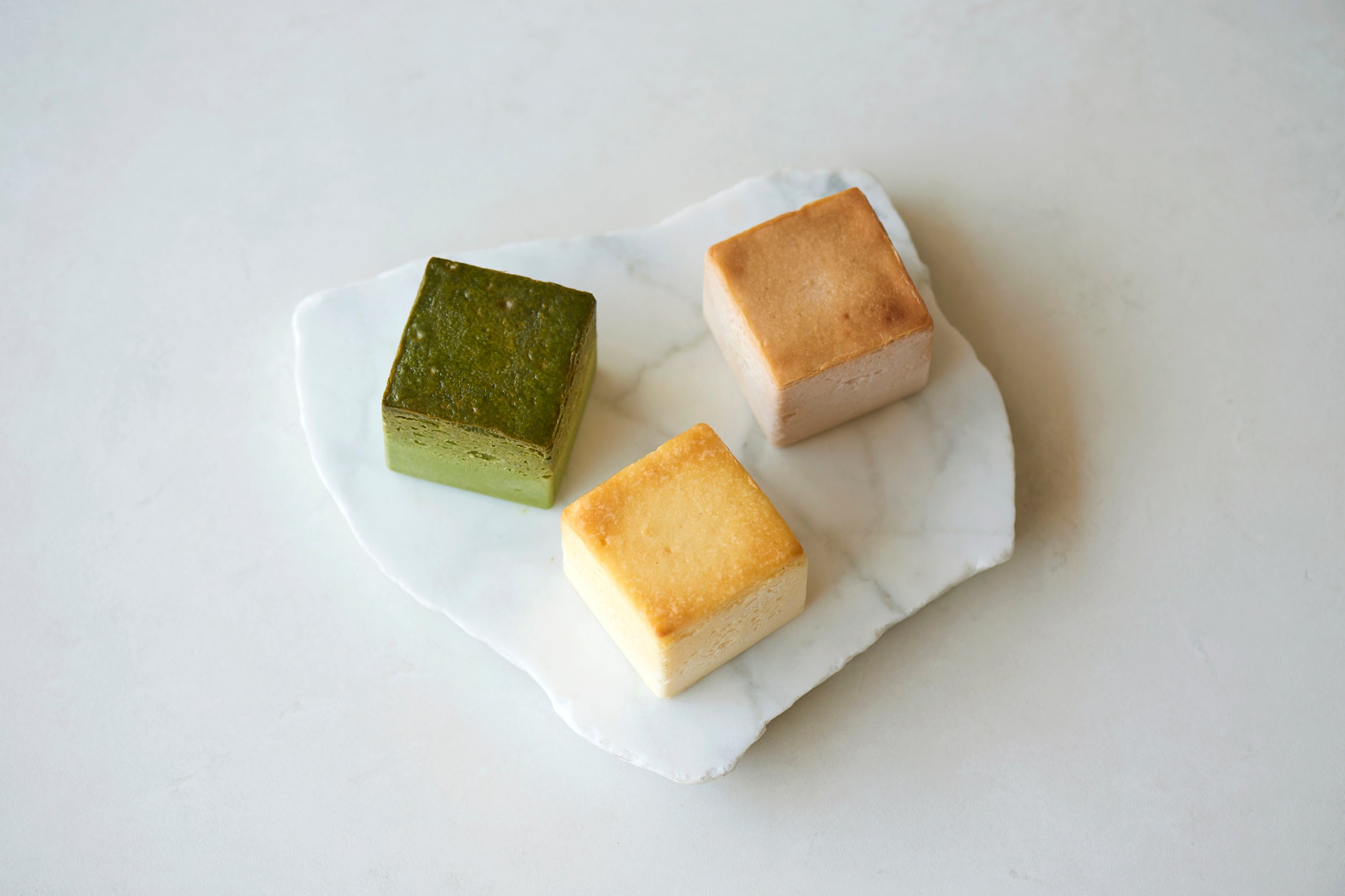 バニラ・レモン・トンカ豆が生み出す甘く爽やかな香りが特長の定番フレーバーと、ストロベリーを主役に、山椒やライムを合わせた甘味と軽やかな酸味を楽しめるストロベリーフレーバー、そして、旨味の強い八女抹茶に、赤砂糖やマスカルポーネを組み合わせた甘くコクのあるグリーンティーフレーバーの3種を一度に楽しめるアソートセット。大切な人とひと口ずつシェアできるキューブ型のケーキをオリジナルBoxに詰めてお届けします。