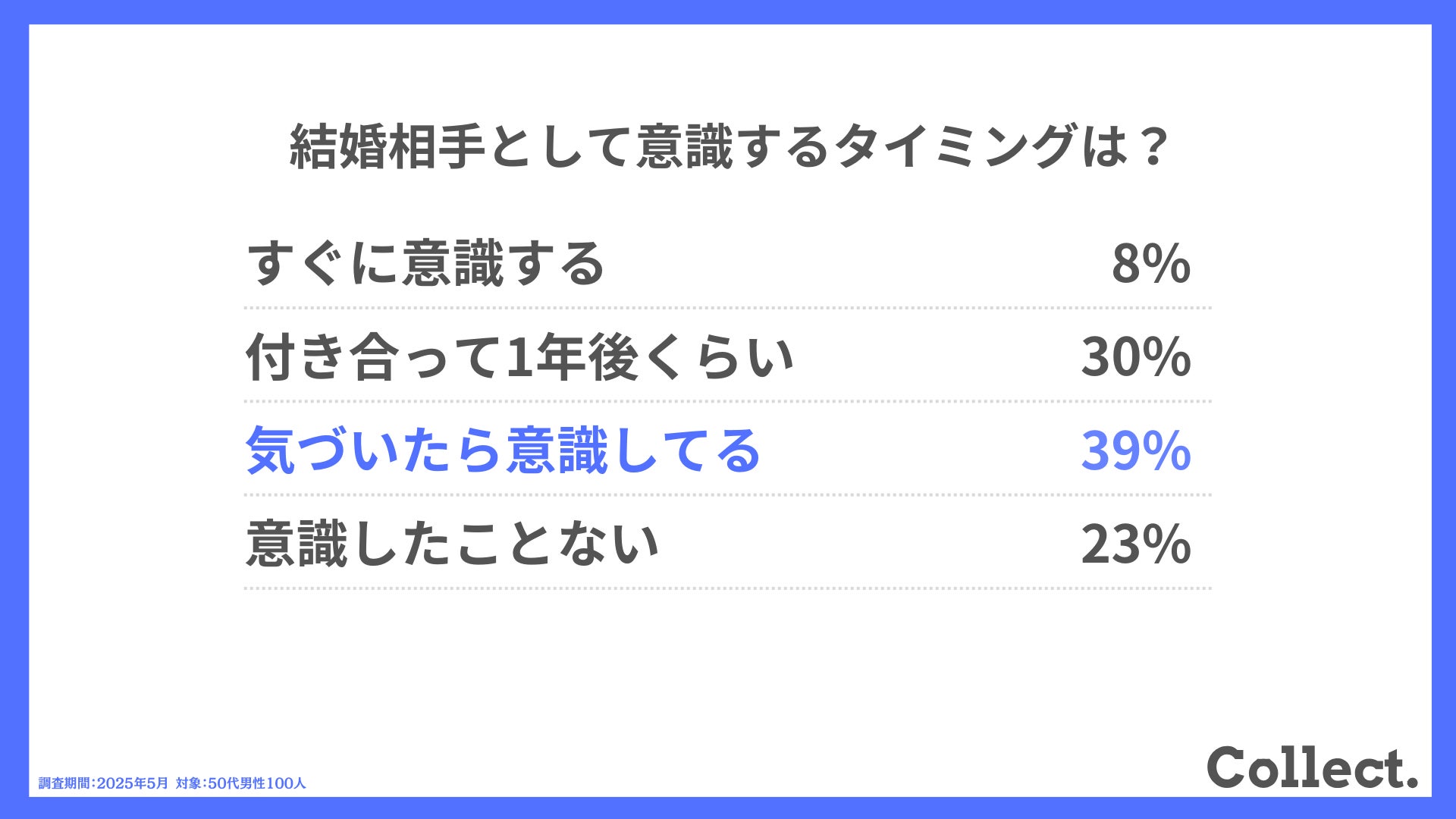「気づいたら意識している(39%)」「付き合って1年後くらい(30%)」と、時間経過で徐々に意識の変わる傾向が明らかな回答結果となりました。まずは自然な関係づくりをサポートする場が求められます。