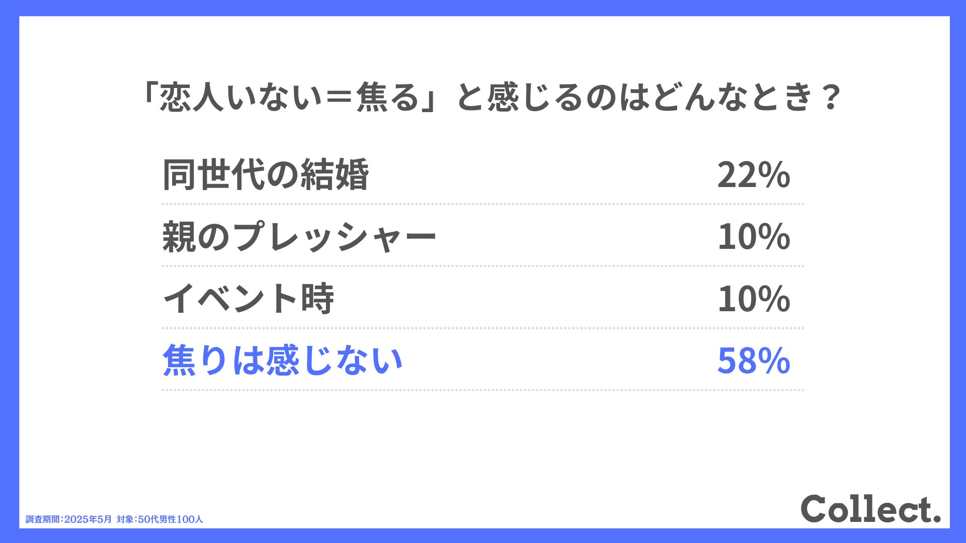 「焦りは感じない(58%)」と、恋愛に対するスタンスの “落ち着き” が強く印象づけられた一方、「同世代の結婚(22%)」が刺激になるという声もあり、自然なタイミングで行動を起こせる環境づくりがカギを握っているようです。