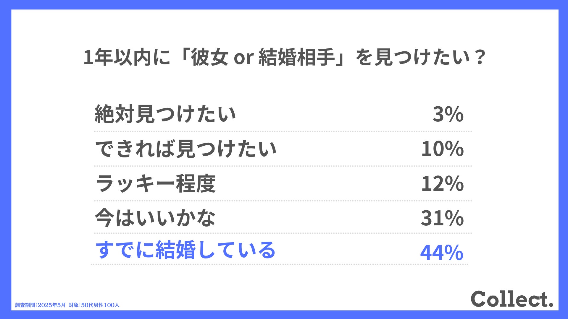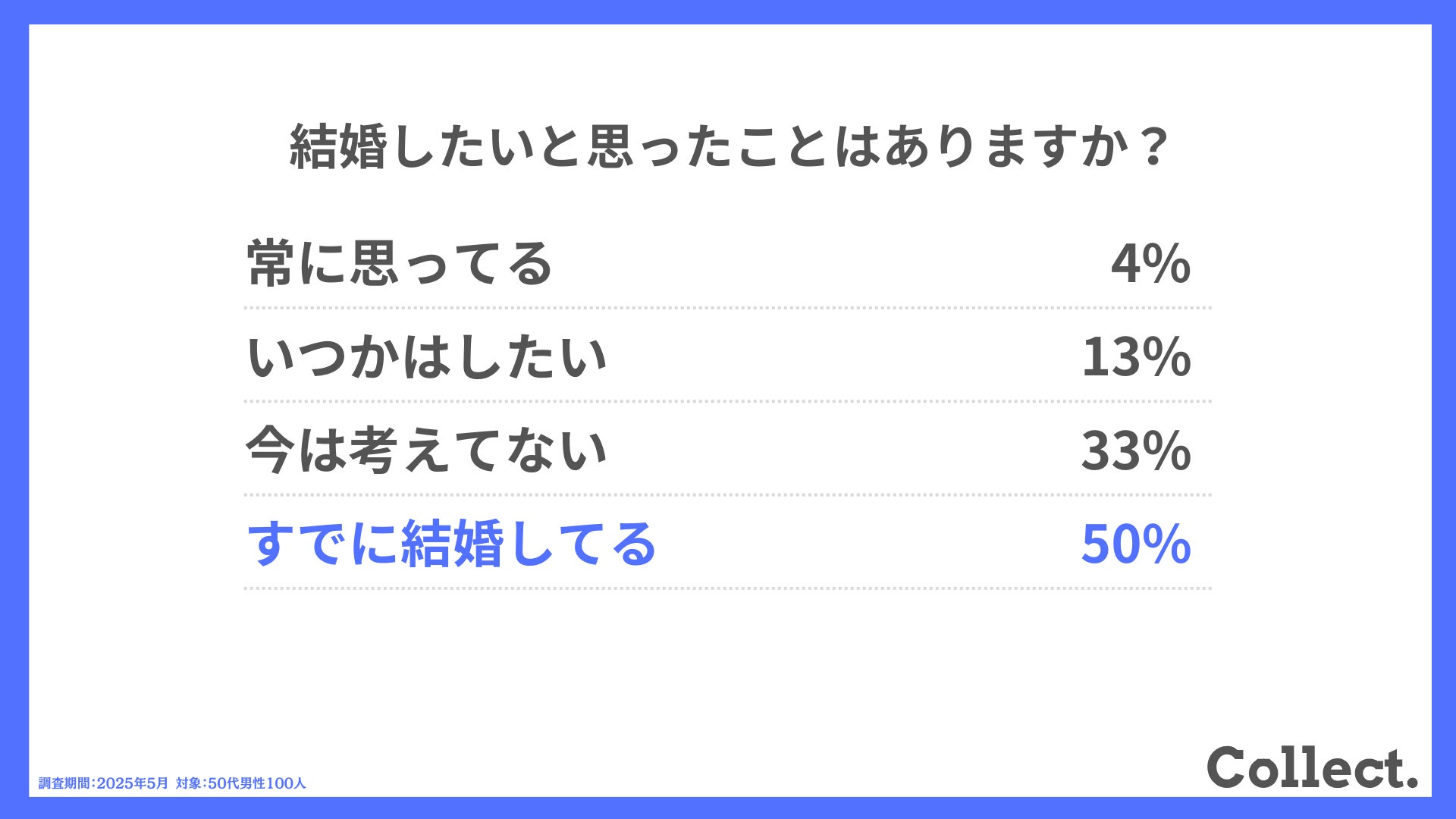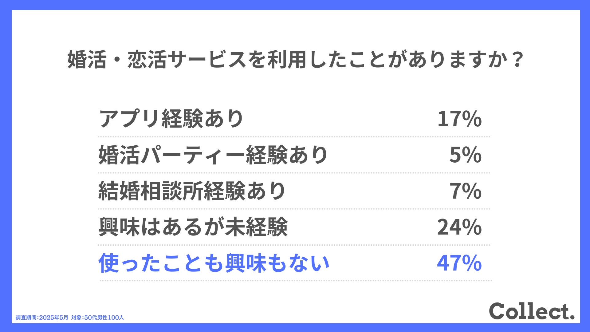 ディーエムソリューションズ株式会社(東証スタンダード上場)が運営するメディア「Collect.(コレクト)」では、50代男性100人に婚活についてのアンケート調査を実施しました。