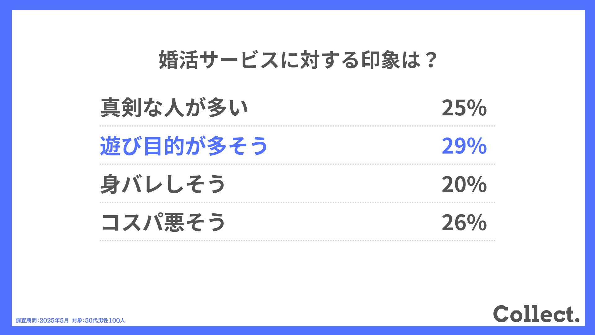 「遊び目的が多そう(29%)」「コスパ悪そう(26%)」と、全体としてネガティブな回答が強い結果になりました。一方で「真剣な人が多い(25%)」と、信頼できると感じている層も一定数存在していることがうかがえます。