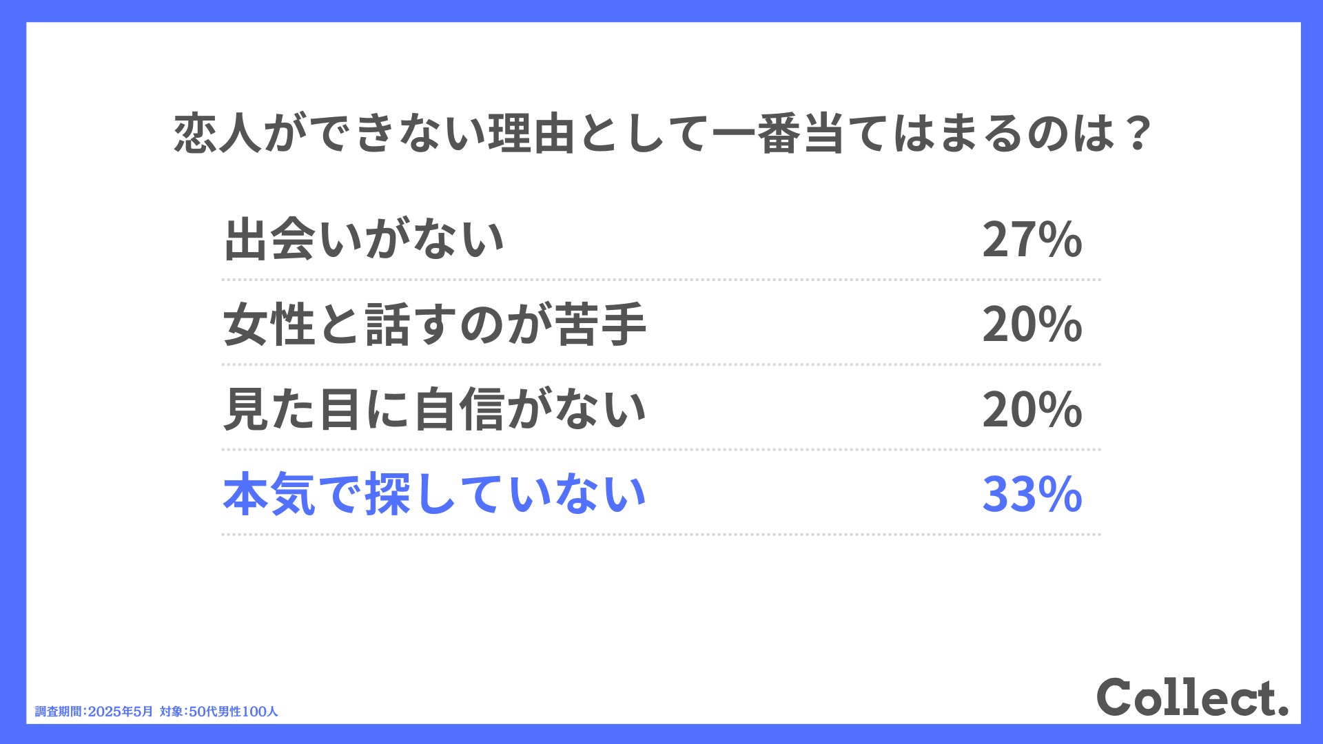 「本気で探していない(33%)」が最も多く、「出会いがない(27%)」が続きました。また、「女性と話すのが苦手」「見た目に自信がない(各20%)」といった回答もあり、意識や行動のギャップや自己肯定感の低さが恋愛の障壁になっている様子がうかがえます。