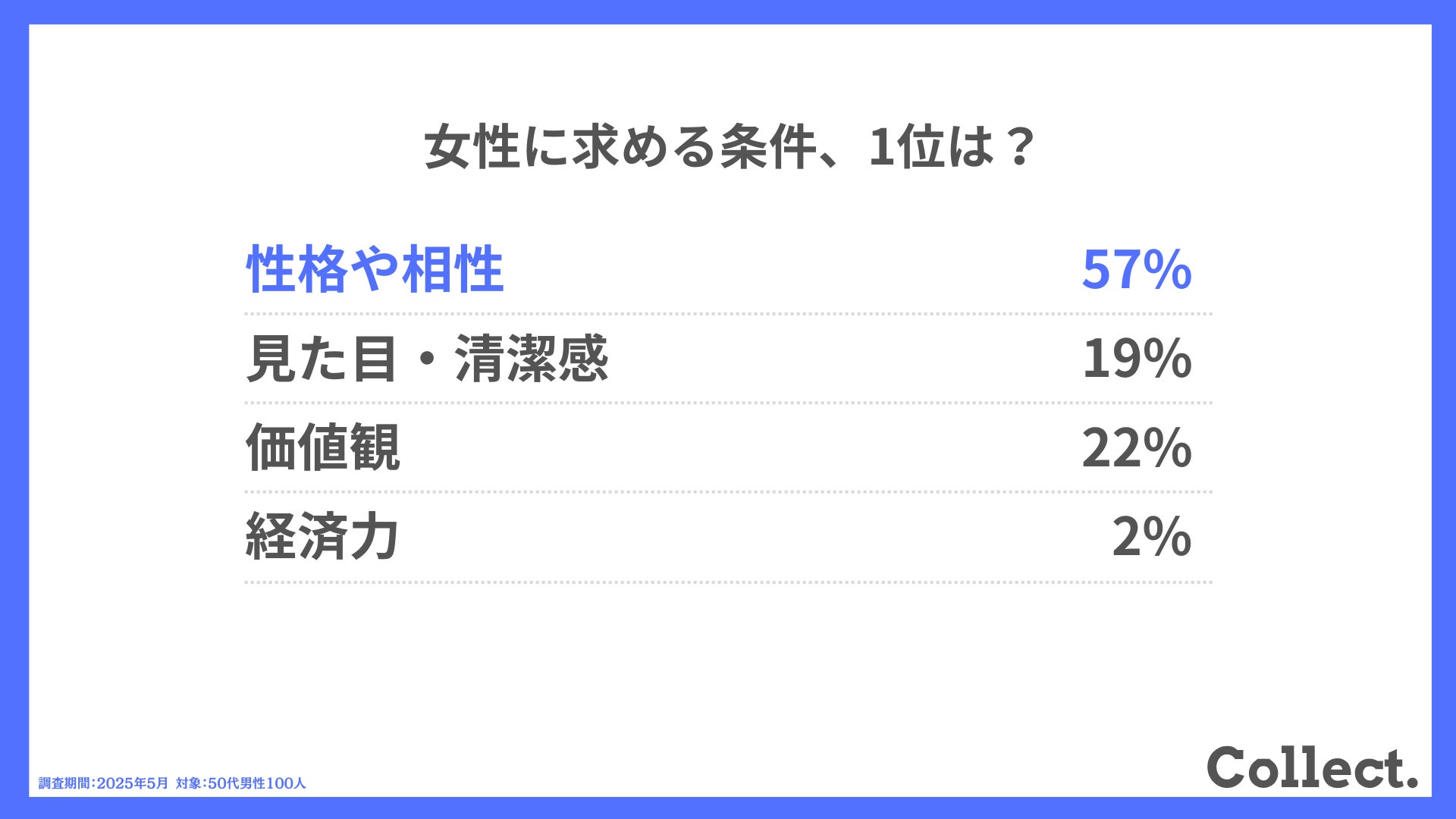 最多の「性格や相性(57%)」が「価値観(22%)」「見た目・清潔感(19%)」を大きく上回る結果となりました。50代は見た目やステータス以上に “人柄” を重視しているようです。