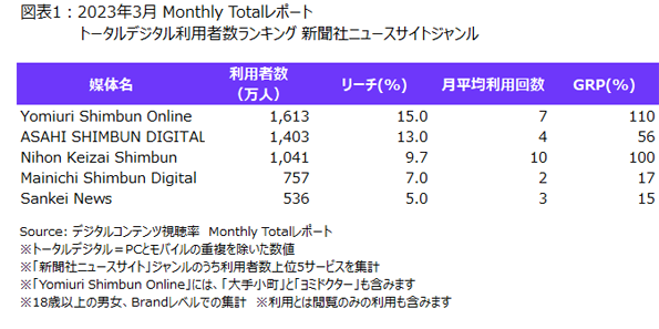 2023年3月のニールセン デジタルコンテンツ視聴率 Monthly Totalレポートによると、国内の新聞社が運営しているニュースサイト(スポーツニュースサイトを除く)ジャンルにおいて、PCとモバイルの重複を除いたトータルデジタルの利用者数が最も多かったのは「Yomiuri Shimbun Online」で1,613万人が利用しており、「ASAHI SHIMBUN DIGITAL」が1,403万人で続いていました。また、月平均利用回数では、「Nihon Keizai Shimbun」が10回で最も多くなっていました(図表1)。