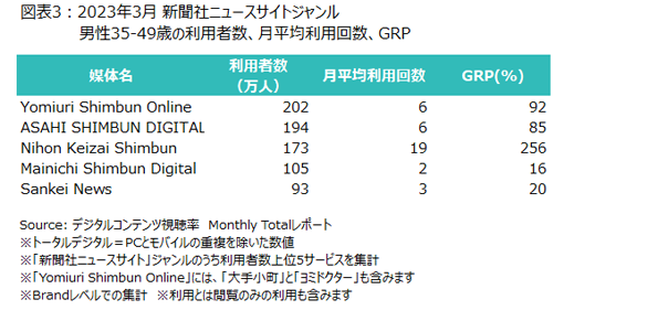 最後に、ターゲットGRP(TARP)が最も高かった男性35-49歳の利用状況をサービス別に見ると、利用者数では全年代の結果と同様、「Yomiuri Shimbun Online」(202万人)が最も多く、「ASAHI SHIMBUN DIGITAL」(194万人)が続いていました。また、平均利用回数では「Nihon Keizai Shimbun」が月平均19回で最も多く、GRPにおいても256%で最も高くなっていました(図表3)。