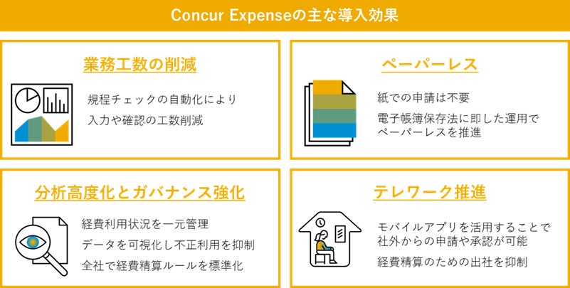 「Concur Expense」を導入することで拠点ごとに異なっていたルールが標準化され、経費の利用状況の可視化が可能になり、業務効率化、ガバナンス強化の両方を実現しています。