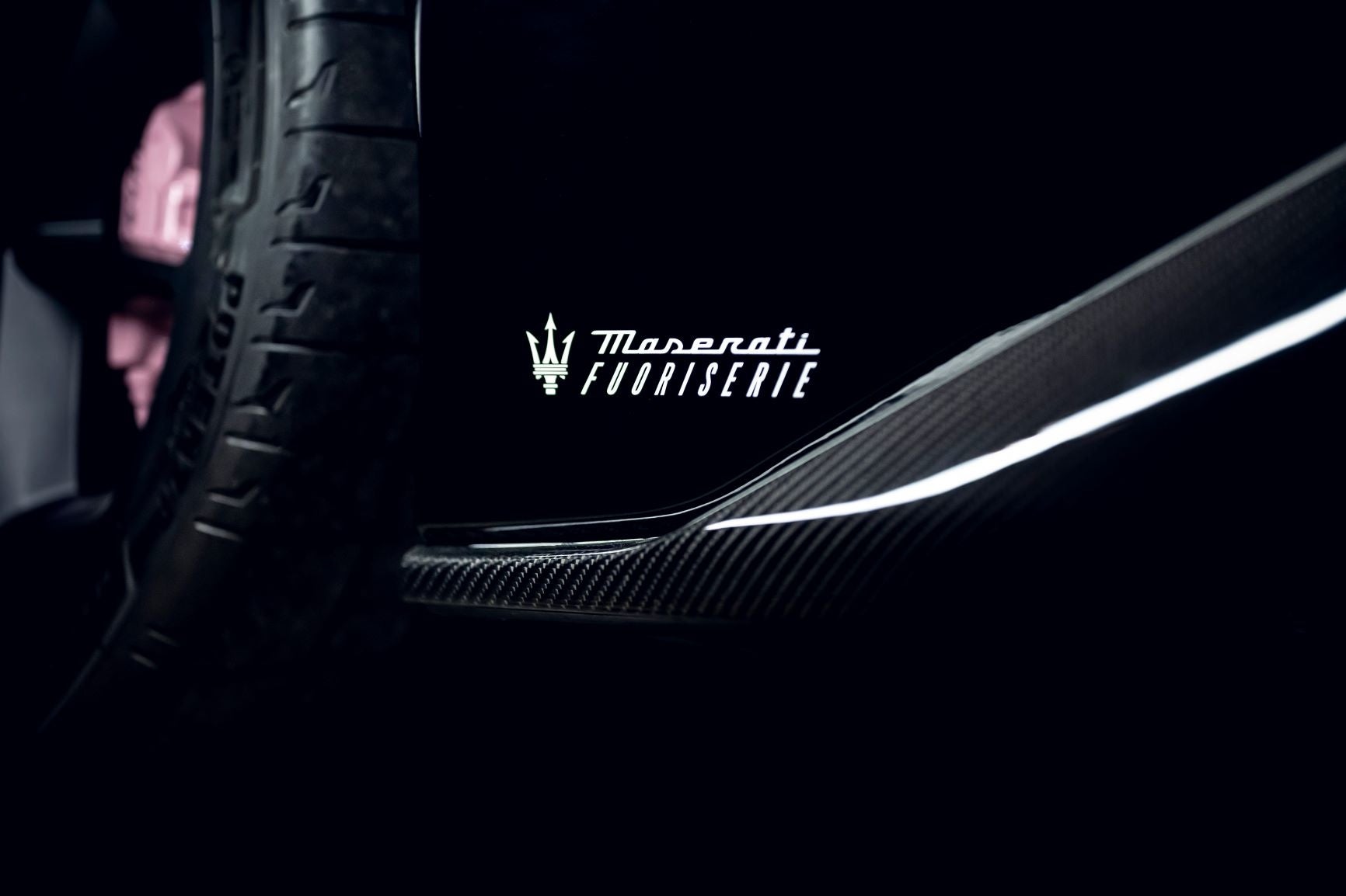 クラブカラーやユニフォームからインスピレーションを得て、ボディにはグロッシーブラックを採用。同じブラックでもグリルとCピラーにはオパーク仕上げのトライデントロゴが施されており、ボディのグロッシーブラックとのコントラストが際立っています。リアに刻まれたマセラティのレタリングも同じくオパーク仕上げですが、ドアにあるMC20バッジとブレンボ製ブレーキキャリパーにはパステルピンクが使用されています。