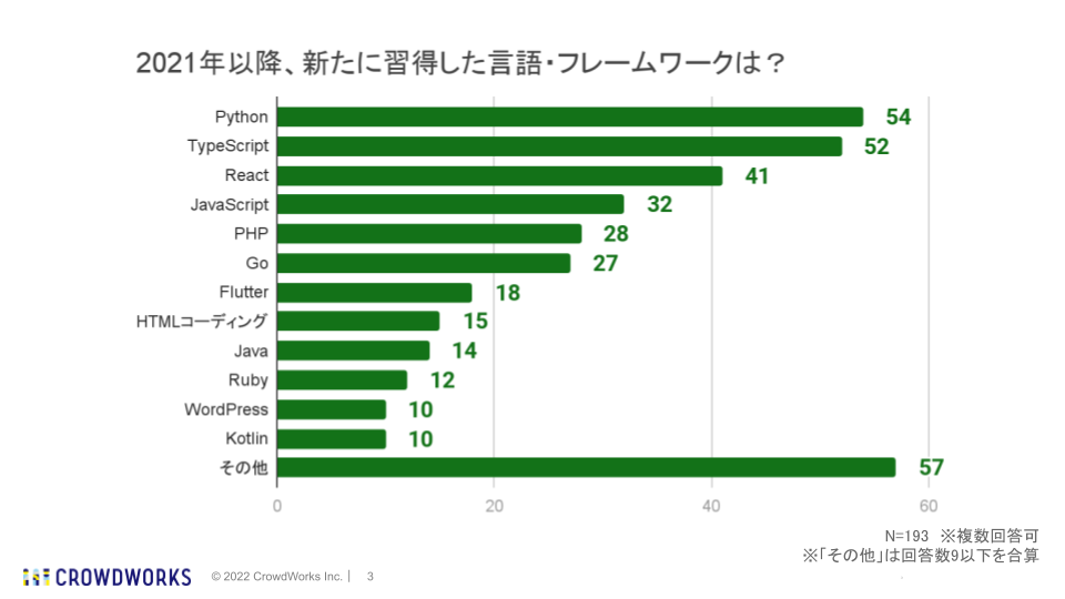 また、新たに習得した言語・フレームワークについて尋ねたところ、トップは「Python」。機械学習やAIの開発に適しているとされる点が人気を集めたものと考えられます。