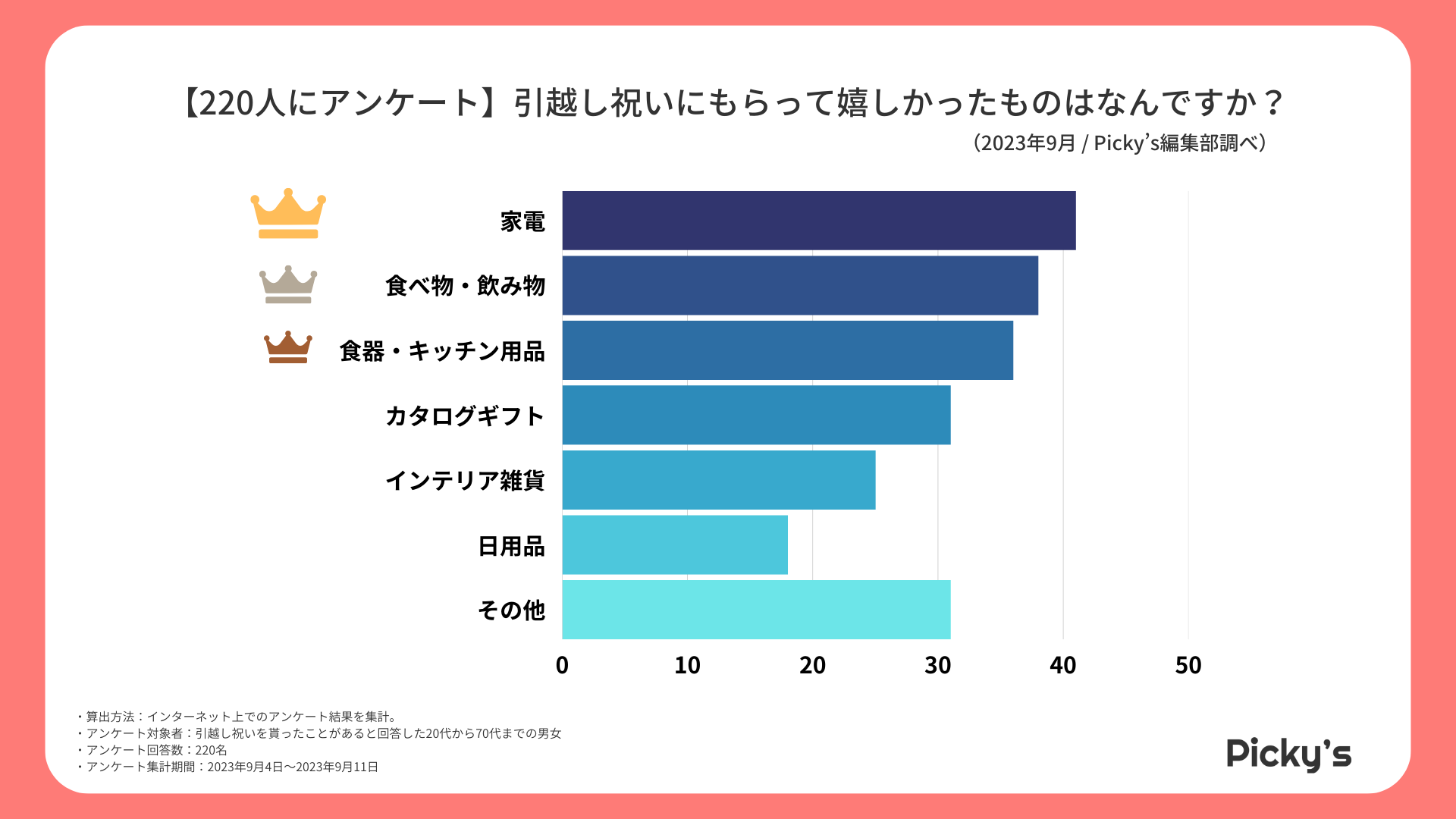「Picky’s」は、インターネットショッピングにおいて、購入前に試せない・選ぶべきものがわからないという課題の解決を目標に、あらゆる商品のおすすめランキングや検証レビューを紹介するサイトです。このたびPicky’s(https://rentry.jp/note/)では、引越し祝いについてインターネット上でアンケート調査を行いましたので発表いたします。
