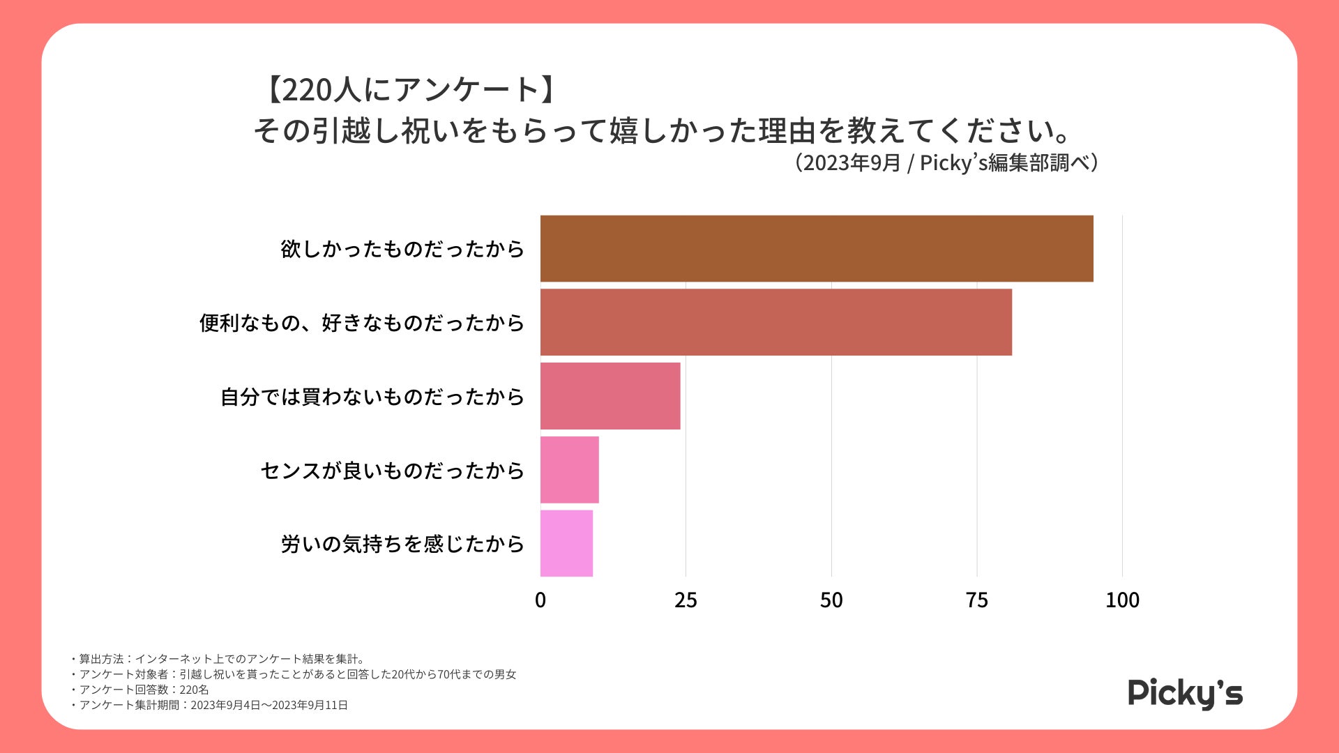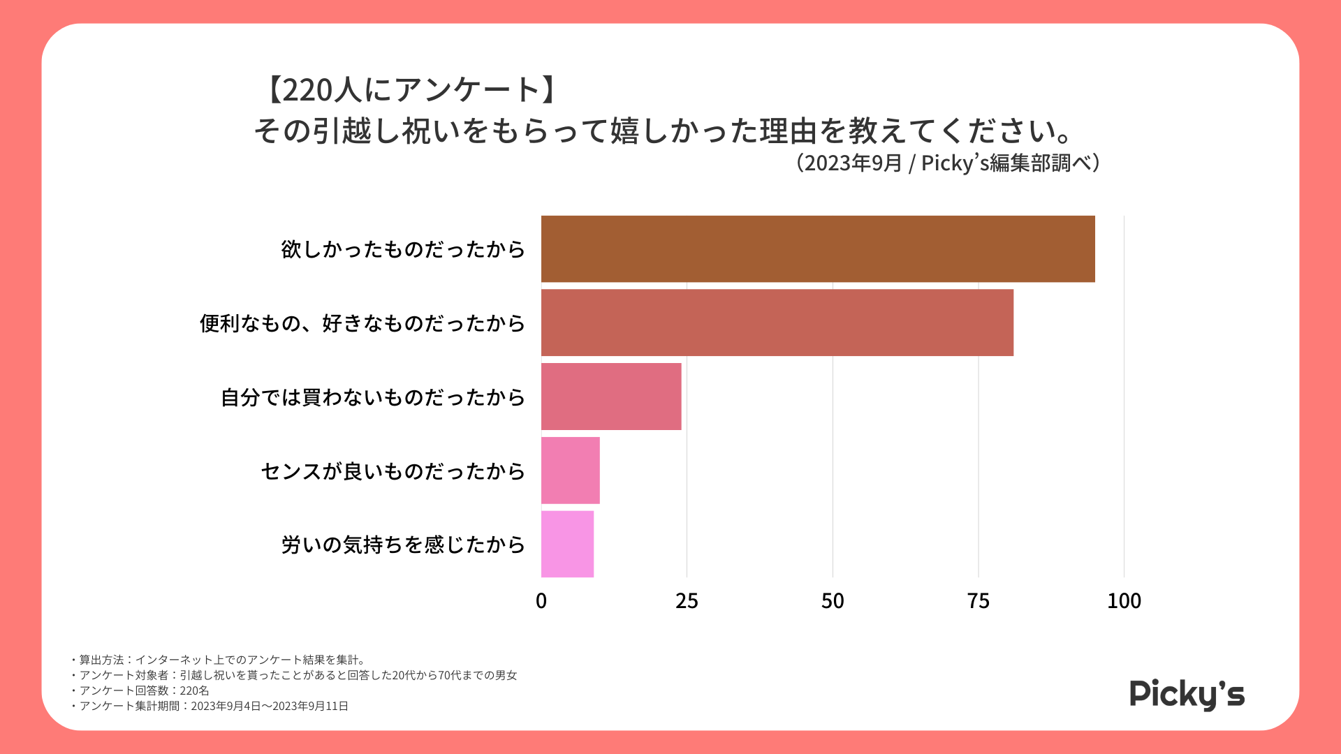 1位の「欲しかったものだったから」は、贈られた引越し祝いが受け取る人の希望や欲求に合致していたことを示しています。受け取る人が心から望んでいたものであれば、その価値と喜びは高まります。2位の「便利なもの、好きなものだったから」は、実用的で便利なアイテムや、受け取る人の好みに合ったものが贈られた場合に喜ばれたことを示唆しています。贈り物が受け取る人の希望や生活に寄り添ったものであれば、その価値と喜びは大きいことがこのアンケートでわかりました。
