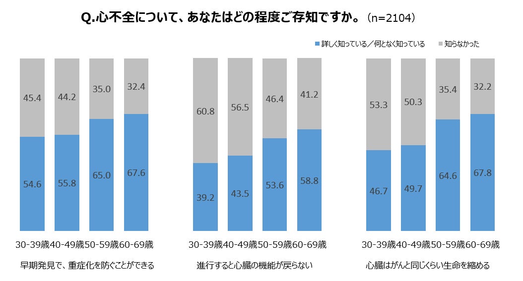 世代別では、「早期発見で重症化を防げる」(全体60.8%、30代54.6%、40代55.8%、50代65.0%、60代67.6%)、「進行すると心臓の機能が戻らない」(全体48.8%、30代39.2%、40代43.5%、50代53.6%、60代58.8%)、「心不全はがんと同じくらい生命を縮める」(全体57.3%、30代46.7%、40代49.7%、50代64.6%、60代67.8%)の項目では若い世代ほど認知度が低く、30-40代は心不全への関心が低いことが伺えます(図表3-2)。