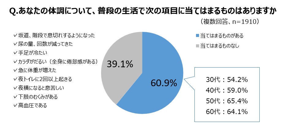 体調について普段の生活で当てはまるものを聞いたところ、心不全の何らかの危険因子を有している人(以下設問で該当の項目を選択した人)は全体で60.9%でした。年代別では、30代が54.2%、40代が59.0と、30-40代でも5割以上の人が心不全の危険因子を有していることが読み取れます(図表2-1)。