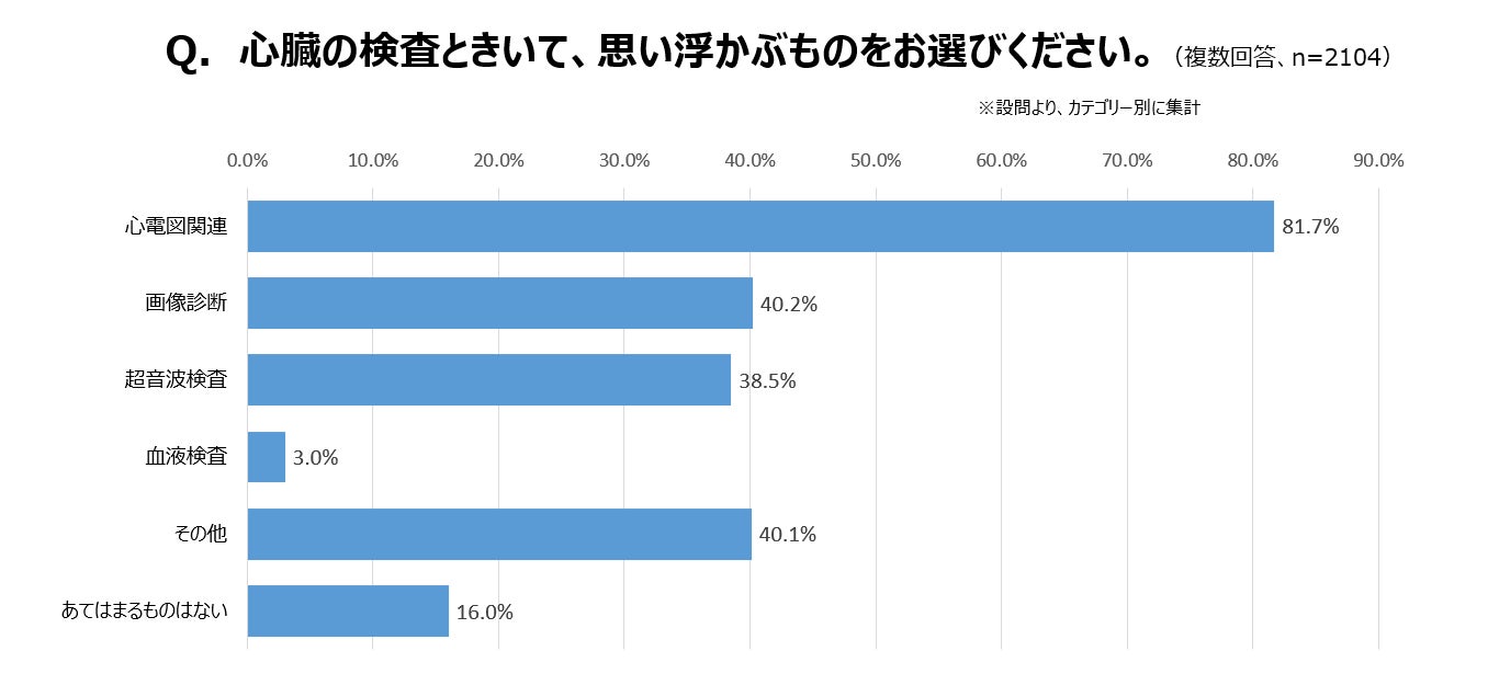 また、心臓の検査ときいてイメージするものでは、「心電図関連」(81.7%)が最も多く、次いで「画像診断」(40.2%)、「超音波検査」(38.5%)となりました。「血液検査」と答えた人はわずか3%と、ほとんどの人が、血液で心臓の状況を検査できることを思い浮かばないことが分かりました(図表1-2)。