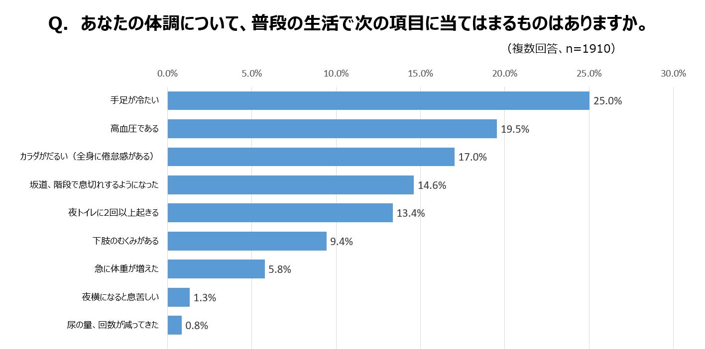 項目別では、「手足が冷たい」(25.0%)が最も多く、次いで「高血圧である」(19.5%)、「カラダがだるい」(17.0%)、「坂道、階段で息切れするようになった」(14.6%)となりました(図表2-2)
