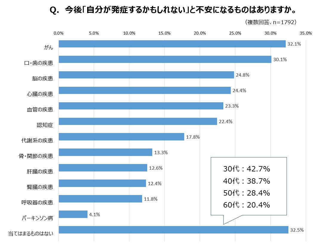30代・40代では「当てはまるものがない」(30代42.7%、40代38.7%)が約4割と最も多く、働き盛りの世代は疾病への意識が低い結果となりました(図表2-5)。