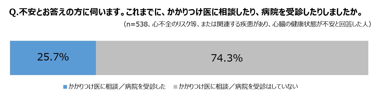 心不全の何らかの危険因子を有している人のうち、約5割が「心臓の健康状態に不安を感じる」(52.6%)と回答(図表2-3)。そのうち、「かかりつけ医に相談もしくは病院を受診した」人は25.7%にとどまりました(図表2-4)。身体の不調や心臓に不安を感じていても、多くの人がそのままにしてしまっていることが伺えます。