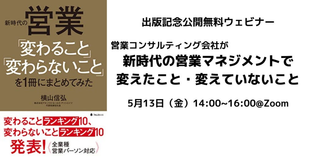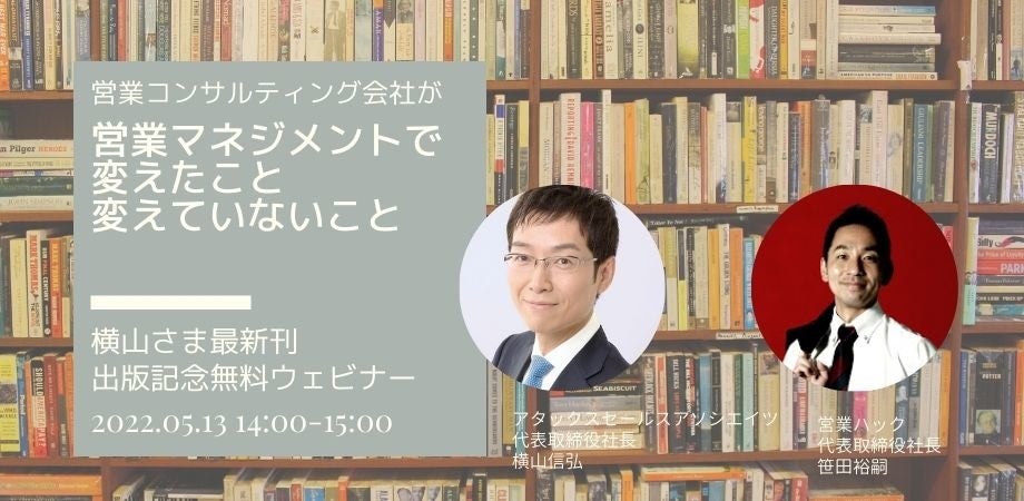 株式会社営業ハック(本社:東京都港区、代表:笹田裕嗣)と株式会社アタックスセールスアソシエイツ(本社:、代表:横山信弘)共催でオンラインセミナーを行います。日時は5月13日(金)14:00〜15:00、テーマは「新時代の営業マネジメントで変えたこと・変えていないこと」です。4月に横山さまが「新時代の営業変わること・変わらないことを1冊にまとめてみた」を出版されました。その最新刊出版を記念し、本セミナーを開催いたします。営業に携わるすべての方のご参加を心よりお待ちしております。