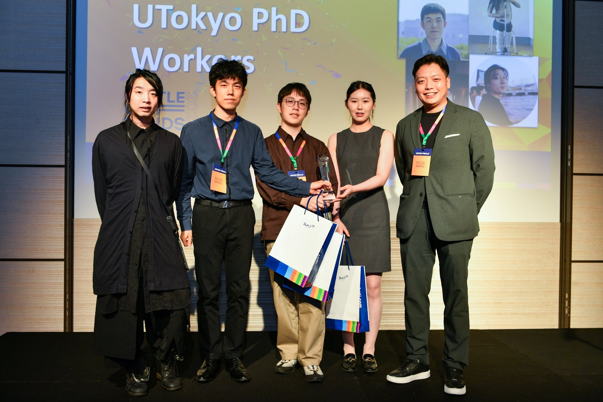 「UTokyo PhD Workers」は、Z世代向けの言語学習の課題に着目。AIで生成した自分自身「デジタルツイン」を先生とすることで、脳内を刺激しモチベーションを上げる方法を、アプリのデモンストレーションで提示しました。市場の分析や、立案された収益モデル、あらゆるリスクの特定と対処への精度が評価されました。