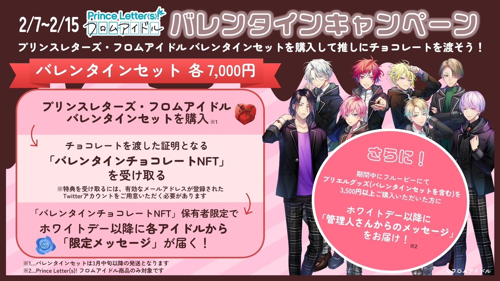 さらに、同期間で開催する企画として、『Prince Letter(s)! フロムアイドル』のグッズ3,500円以上(税込・送料別)商品をお買い求めいただくと、私立常和歌学園男子部管理人さん宛にバレンタインチョコレートが贈られ、各アイドルと同様に【バレンタインチョコレートNFT】が付与され、保有しているお客様を対象に、私立常和歌学園男子部管理人さんから届く限定メッセージ画像を3月14日(火)0時よりご覧いただけます。