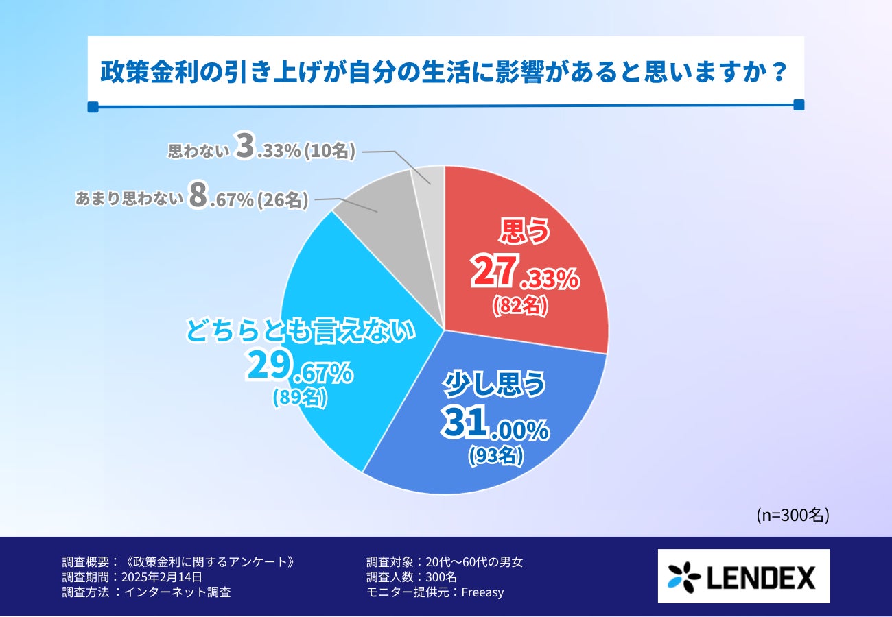 この調査結果から、多くの人が「政策金利の引き上げが自分の生活に影響を与えるかもしれない」と感じていることが分かりました。「思う」「少し思う」と回答した人を合わせると58.33%にのぼり、半数以上の人が「何かしらの影響があるはず」と考えているようです。