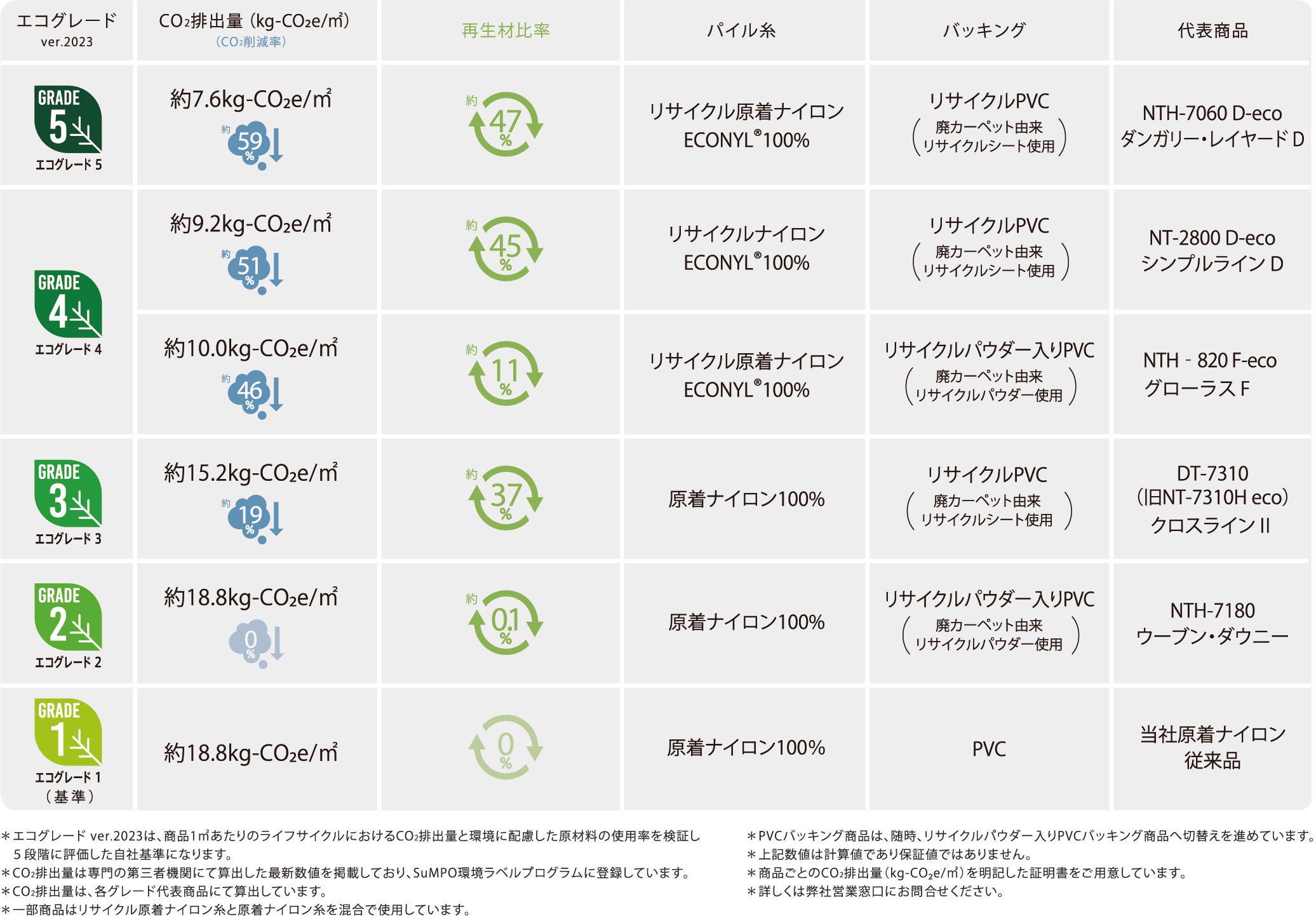 当社は、持続可能な社会の実現に向けて、長期ビジョン【DESIGN 2030】において「みんなで、いつまでも、楽しさあふれる」社会の実現を目指しています。商品開発においても環境に配慮した取り組みを進めており、前見本帳で設定した「エコグレード」を、より精緻化し、環境配慮ランク「エコグレード ver.2023」として再設定しました。「エコグレード ver.2023」は、商品1㎡あたりのライフサイクルにおけるCO₂排出量と環境に配慮した原材料の使用率を検証し、5段階に評価した自社基準です。このうち、アクアフィル社製のリサイクル糸「エコニール (R)」をパイル糸に採用したカーペットタイルは、エコグレード「5」・「4」に値し、CO₂排出量削減と環境汚染軽減に貢献しています。さらに、エコグレード「5」と、「4」の一部は、パイル糸・バッキングともにリサイクル素材を使用した「double eco」商品で、CO₂排出量の大幅な削減と高い再生材比率を実現しました。