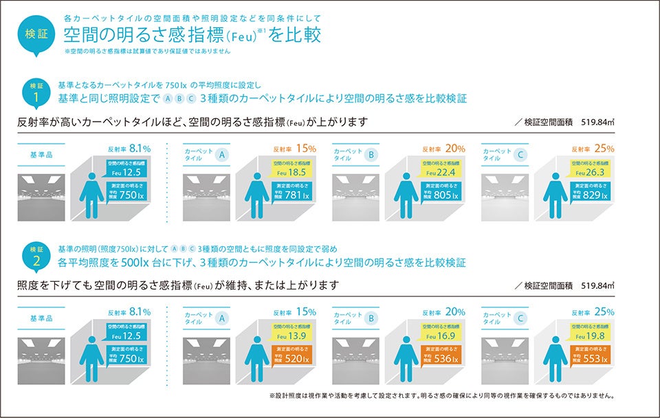 同見本帳は、オフィスワーカーの“WELLNESS”に光環境からアプローチします。従来のオフィス空間では、天井や壁には白色や明るい色が使われる一方、床材には汚れを懸念し濃色が選定される傾向がありました。しかし、最新のオフィスにおいては、自然光を効率的に取り入れた「明るくフレキシブルな空間」がトレンドになっています。こうした中で同見本帳では、設計照度だけではなく、人が感じる「空間の明るさ感」に着目しました。反射率の高い床材を使用することで、空間全体を明るく見せるコーディネートを提案しています。パナソニック株式会社が提供する「空間の明るさ感」を定量化・指標化したFeu(フー)を使用し、特に反射率が15%以上の商品に反射率マークを掲載しています。床材に明るい色を用いることにより、より空間を広く開放的に演出することができ、作業効率の向上やチームの闊達な議論・コミュニケーションを促します。