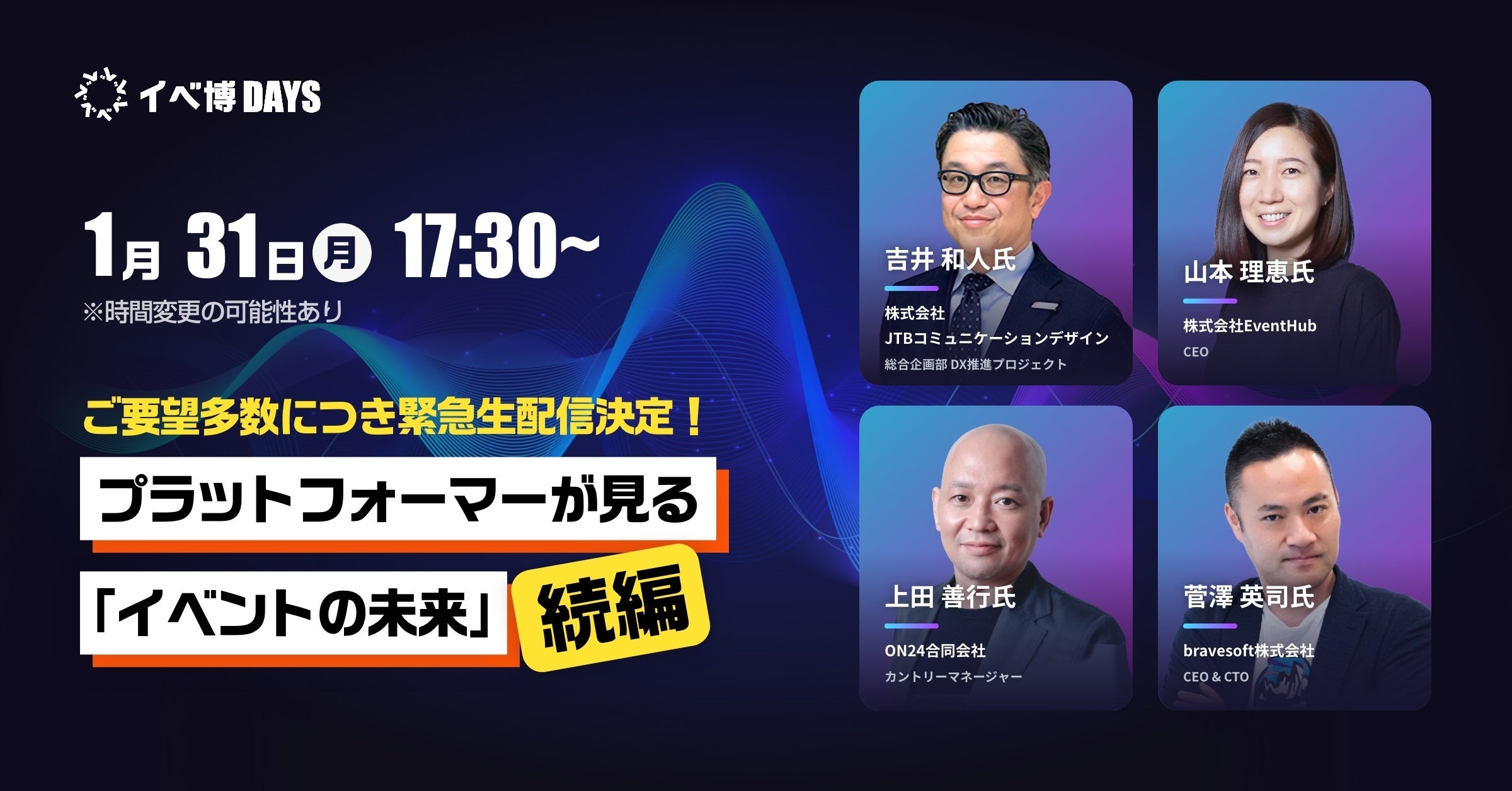 今回、1月31日月曜日に緊急配信する内容は、昨年開催された「イベ博DAYS」において好評だったイベントプラットフォーム提供会社が語るセッションを、リクエストに応えて「続編」という形で配信させていただきます。