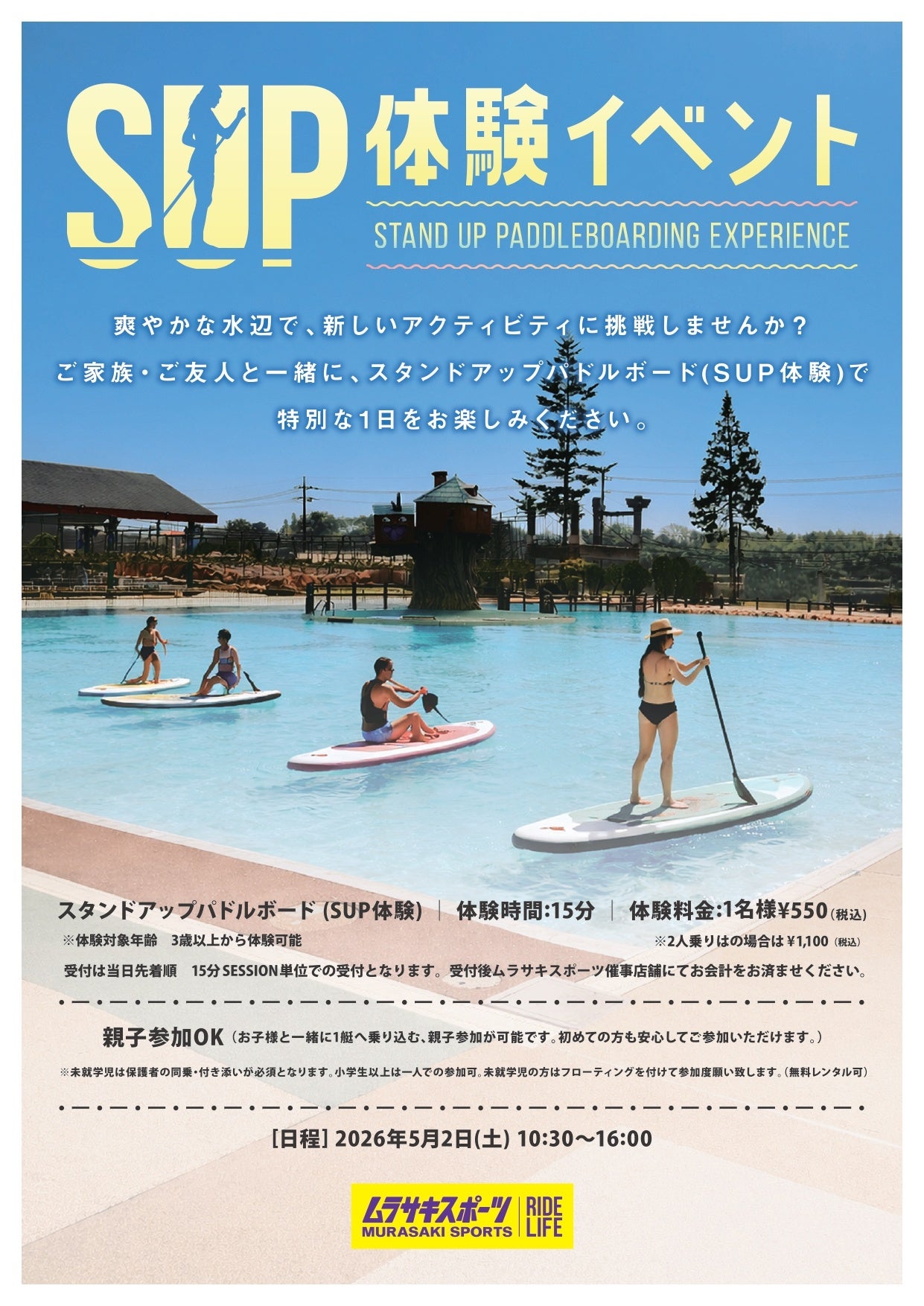 今回のコラボレーションでは、2026年5月2日(土)限定で、東京サマーランドの屋外プール「ビーバーレイク」にて、ムラサキスポーツ主催の「SUP(スタンドアップパドルボード)体験会」を開催します。また、同日には東京サマーランド内にムラサキスポーツが特別出店いたします。