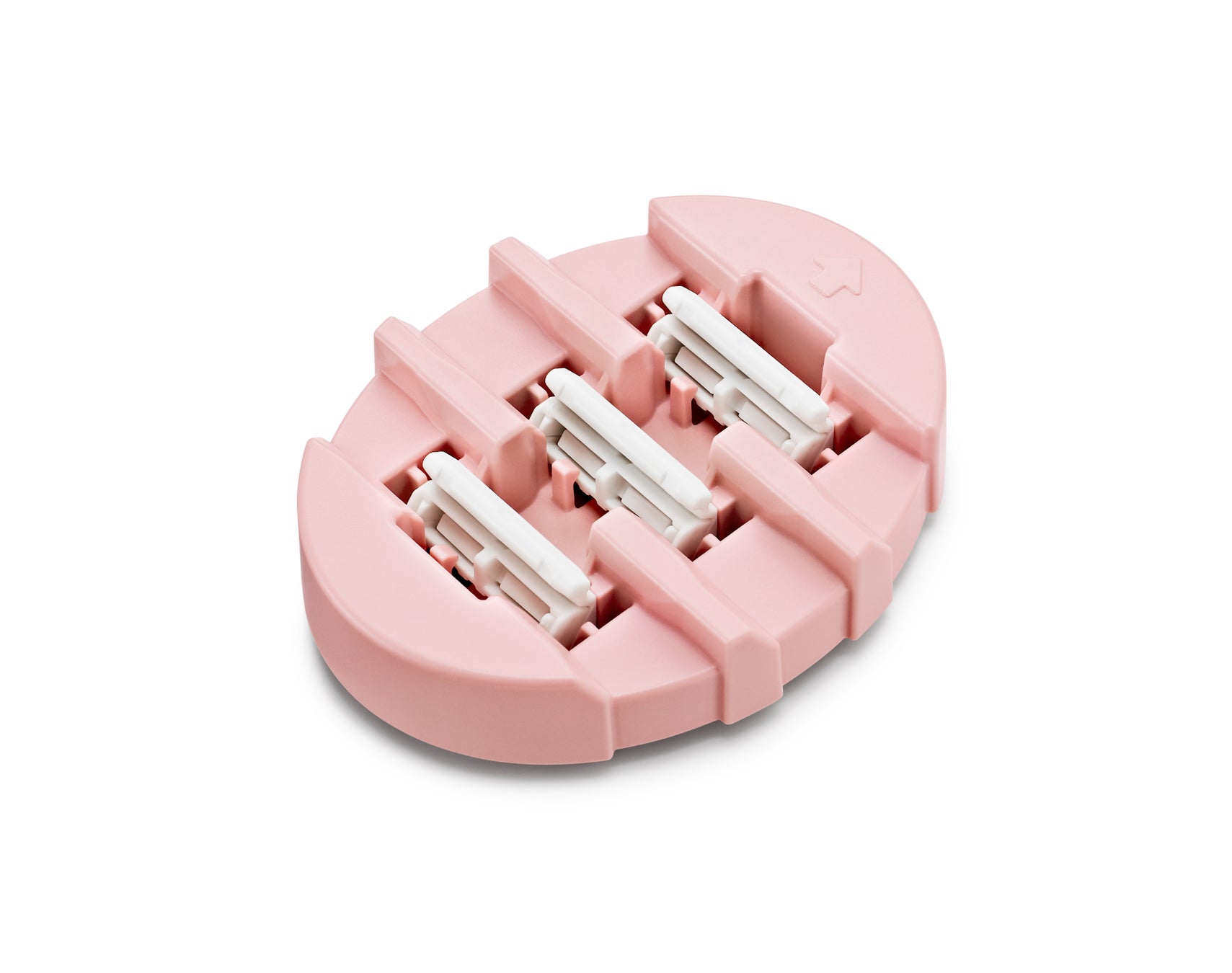 「サロンプラス リップスティックシェーバー 替刃(3コ入)」を同時発売。剃り味が気になった時に交換でき、衛生的かつフレッシュな刃で肌負担なくお手入れしていただけます。新しい替刃とヘッドの中心を合わせ、カチッという音がするまで押し込みホルダーを斜めに押し上げるだけで簡単に交換していただけます。