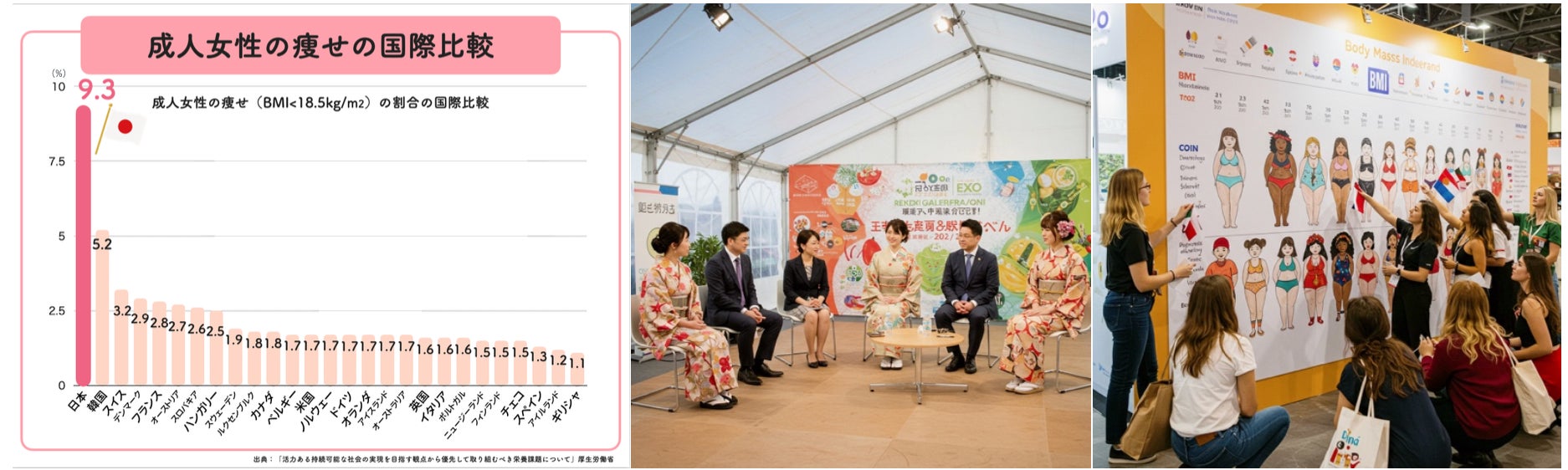 令和5年度の国民健康・栄養調査※2において、過去最高を記録した日本女性の痩せ問題にフォーカスした展示と、各国ゲストにBMI・体脂肪・ヘモグロビン・骨密度が測れる『万博保健室』を体験いただきます。内閣府の「戦略的イノベーション創造プログラム(SIP)」も出展し、国家プロジェクトとしての取り組みを世界に向けて発信します。