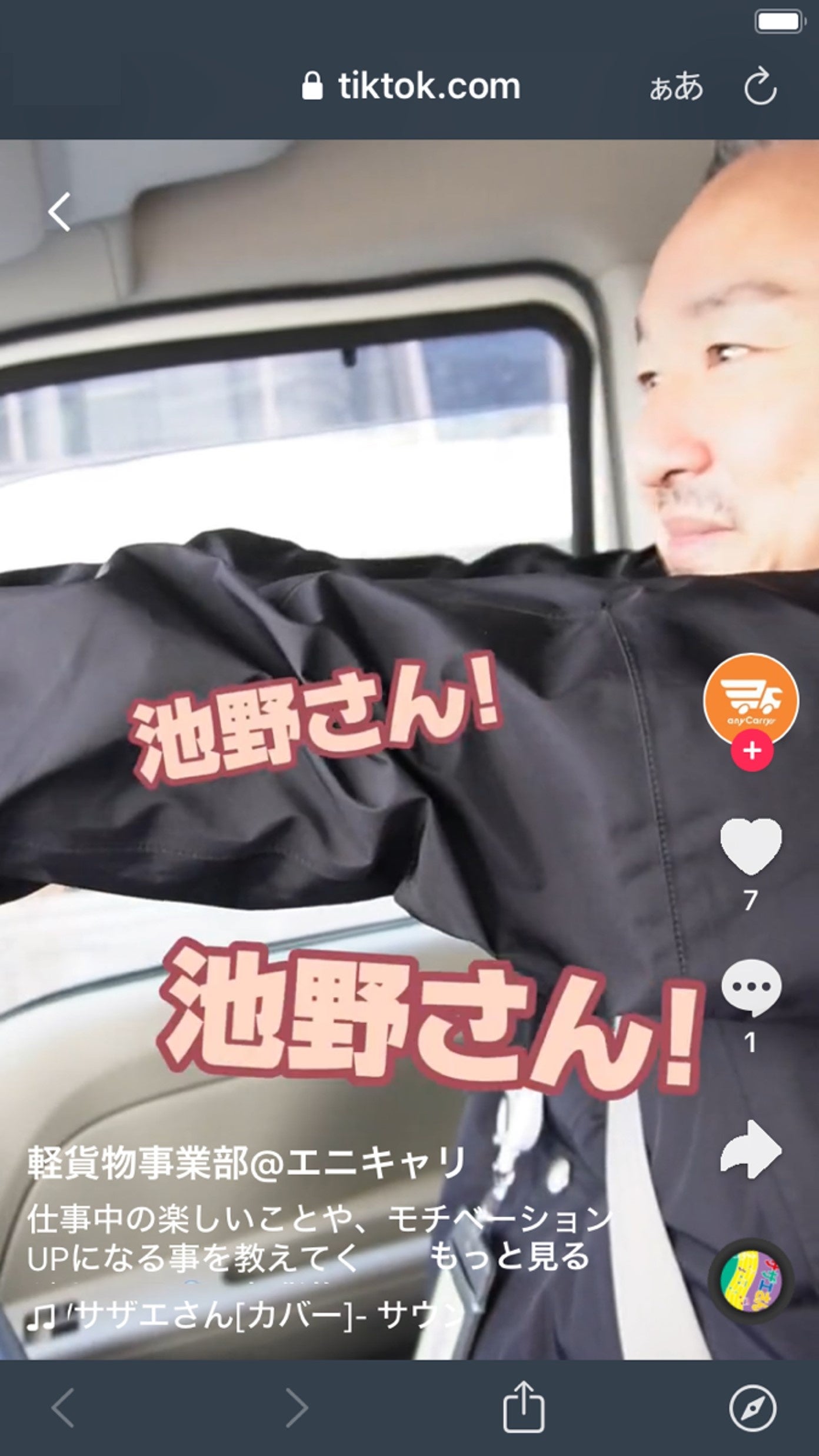 ラストマイルに特化した物流ソリューションを提供する株式会社エニキャリ(以下、当社)は、軽貨物ドライバーあるあるを配信するTikTok公式アカウントを開設しました。このTikTokアカウントでは、軽貨物ドライバーを始めたい人に向けて、報酬形態からランチ事情まで、働き方や環境を知ってもらうために、軽貨物運送事情をよく知る池野さんに様々な問いかけを行い配信しています。「池野さん!池野さん!」で、はじまるやり取りに、少し戸惑いながらも笑顔で丁寧に対応する池野さんのわかりやすい受け答えが楽しめるコンテンツとなっています。