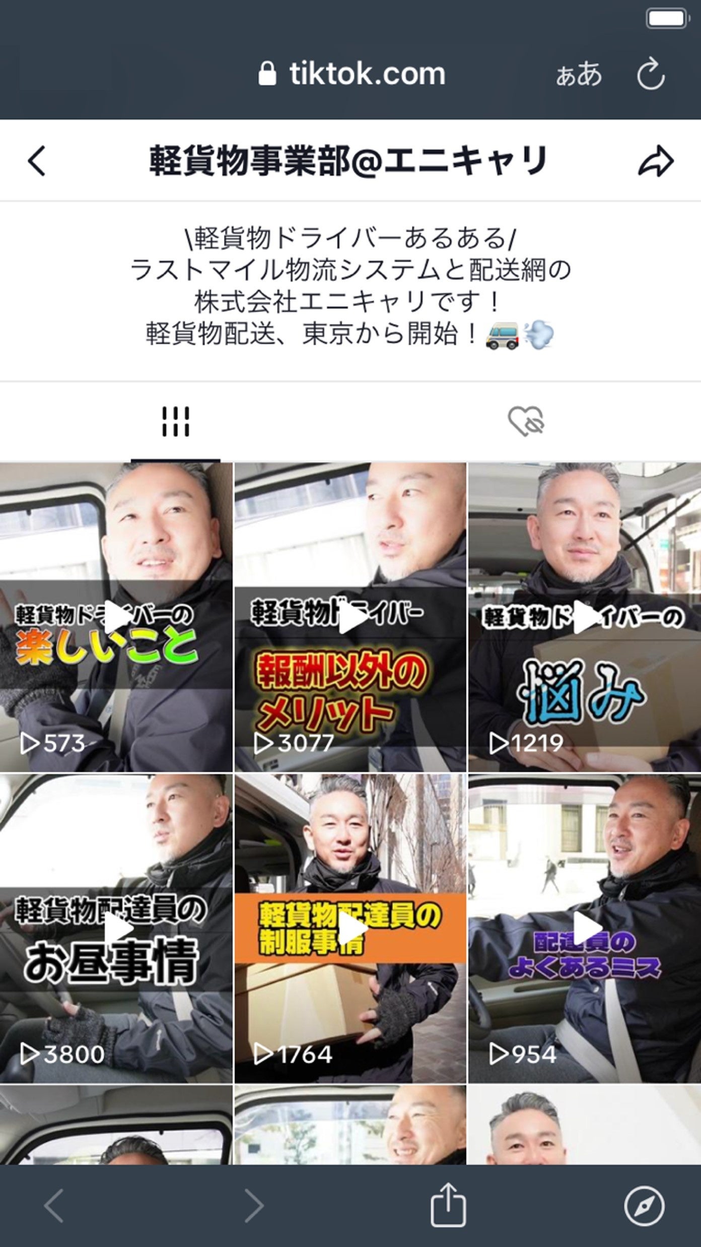 ラストマイル物流「エニキャリ」、公式TikTokをスタート!軽貨物配送を始めたい人に向けて、軽貨物ドライバーあるあるを配信!