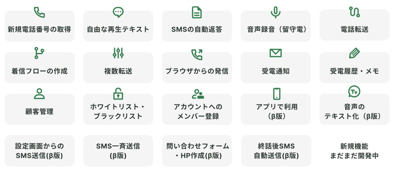 サービスの機能として、電話応答の分岐を自由に設定でき、AI自動応答やSMS返信・電話転送・アプリ転送・顧客管理(CRM)など、フロントオフィスの業務を支える機能を幅広く利用可能です。
