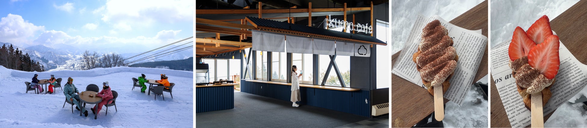 「雪のオープンデッキ」では雪の上に椅子やテーブルを設え、残雪をかぶった2000m級の山々の大パノラマとふもとの新緑のコントラストとこの季節独特の澄み渡る青空が広がり、少し冷たい空気と春のあたたかい日差しが混ざり合い、気持ちよい春を感じられるエリアとなっています。また併設するカフェ「kumo café(くもかふぇ)」では温かいドリンクや期間限定のスイーツをお楽しみいただけます。