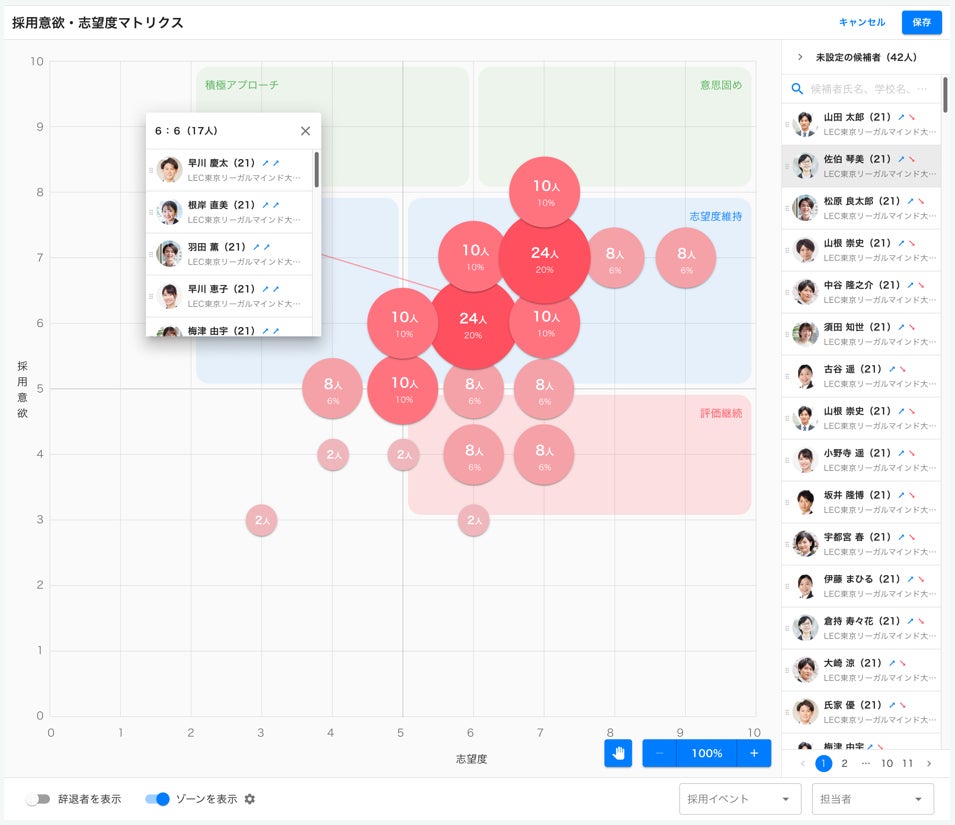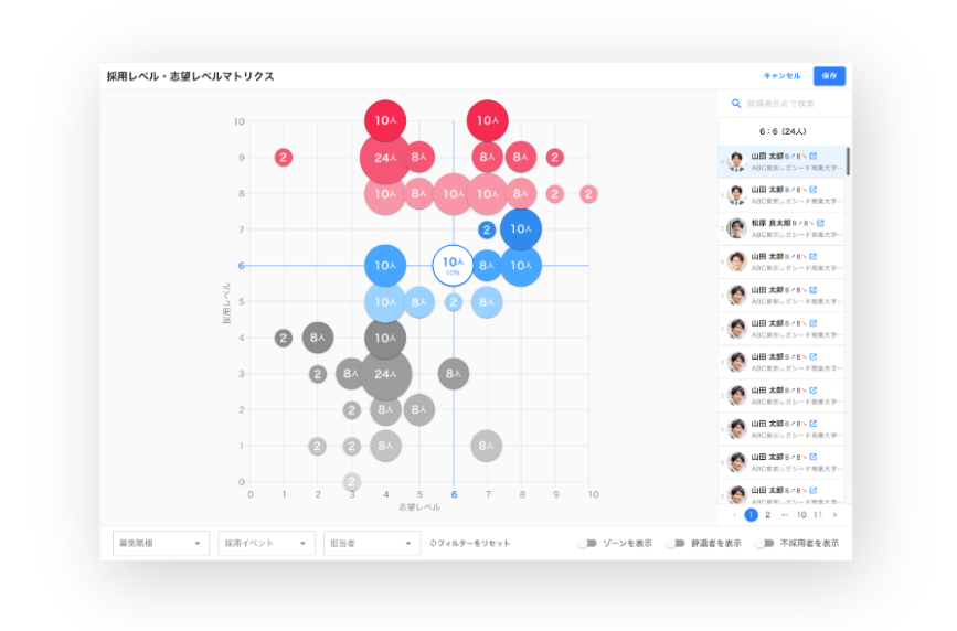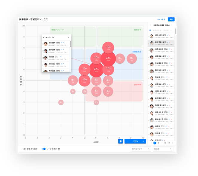 候補者マトリクスでは、企業からの採用意欲と学生からの志望度を入力し、候補者がどの位置にいるかを可視化できます。 チーム内でターゲットに対しての認識を合わせながら、他社に競り勝つための積極的なアプローチができます。