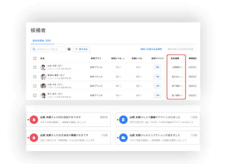 候補者が連絡に対して反応する速度を計測し、傾向を可視化する機能や、学生とどのタイミングで連絡を取る必要があるかを知ることができるアクションアラート機能によって、対応の抜け漏れをなくし “気づいたら他社に内定を決めて選考を辞退された” といったケースを防ぎます。