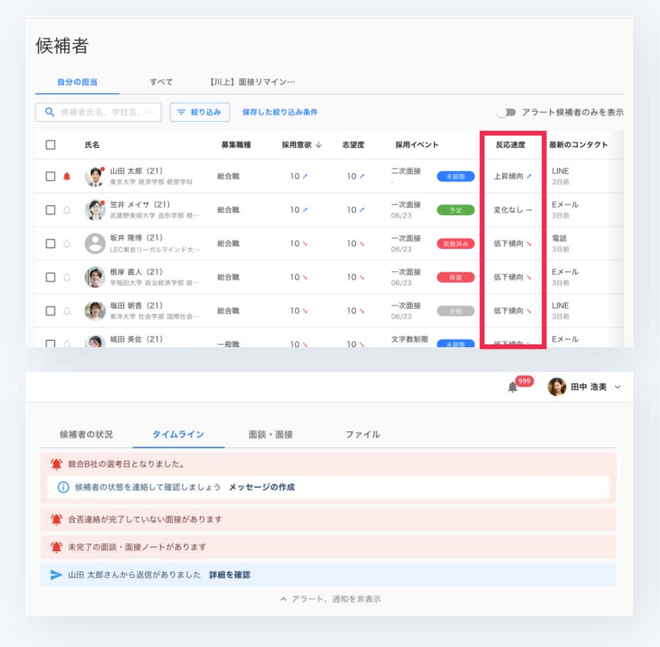 候補者マトリクス、志望度推移、反応速度検知、アクションアラート、