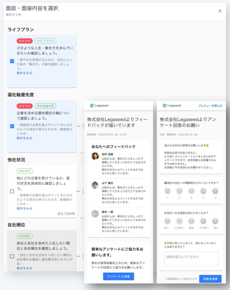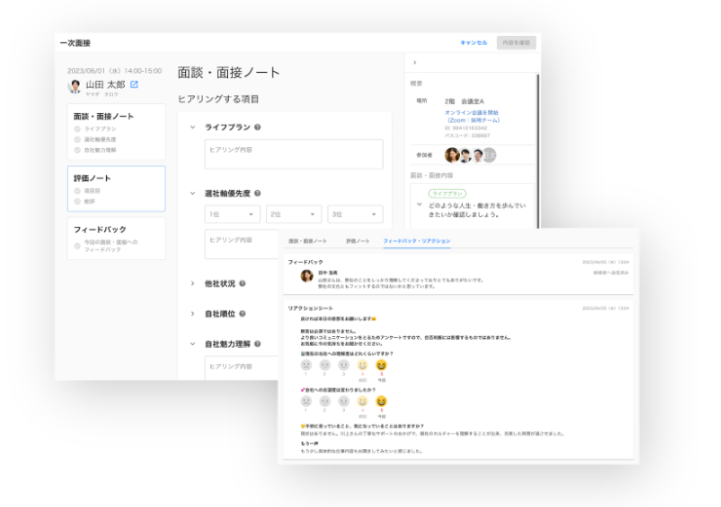 面接官やリクルーターが面談・面接ノートを活用することで、候補者にマッチした自社の魅力を伝えることができます。また面接後に候補者にリアクションシートを回答してもらうことで、面接の効果を把握し次の行動に移すことができます。