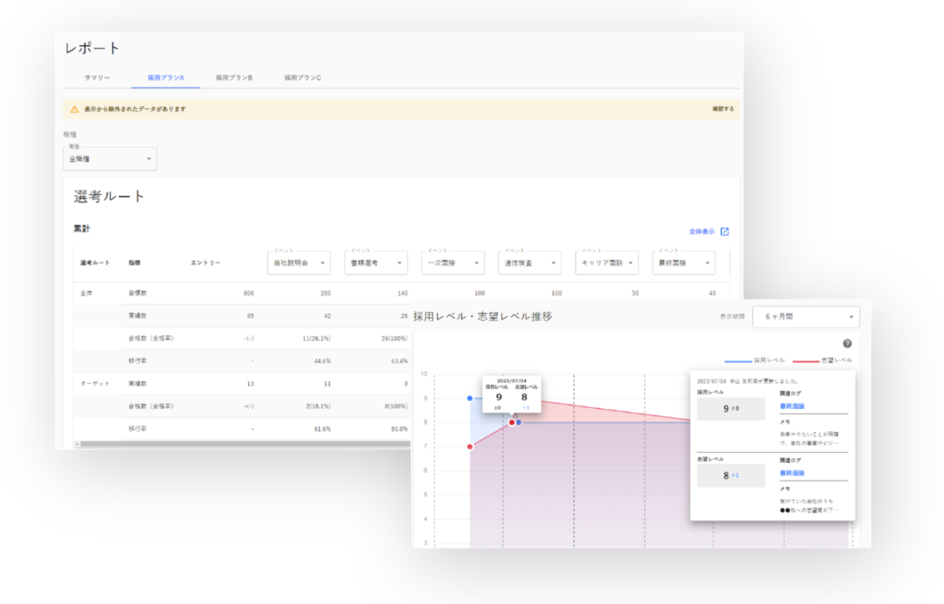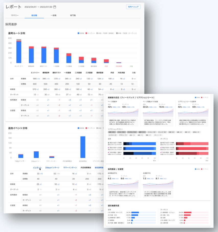 採用活動全体のデータだけでなく、自社のターゲット人材の志望度推移やそれに付随するコミュニケーションログを記録することで、本質的な採用課題の発見に役立てます。定量・定性両側面での分析がチームの採用力を伸ばします。