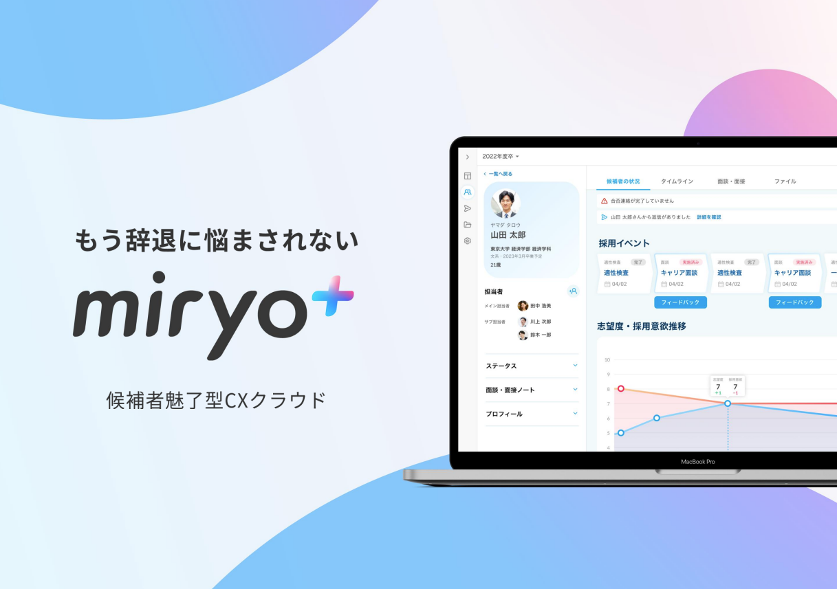 「miryo⁺」は採用業務の効率化だけでなく、候補者に 「この会社に入社したい、ここで働きたい」と思ってもらうための“魅了づけ”を強化することを目的とし、2022年4月に提供を開始した採用管理システムです。当社が創業以来10年間に渡り蓄積してきた採用コンサルティングのノウハウをシステム化した、採用現場に眠る感覚的、属人的、暗黙的な課題を解消できるこれまでにない採用管理システムとして開発しています。